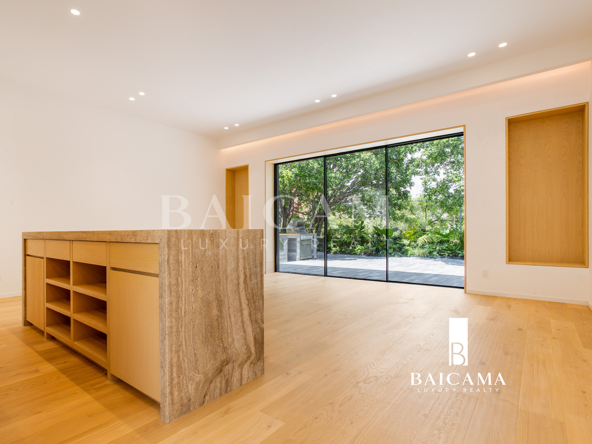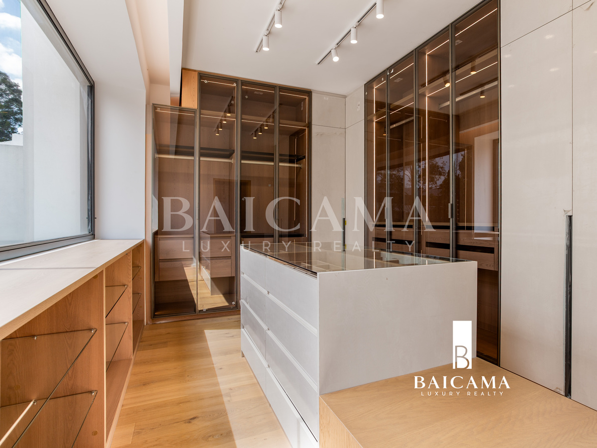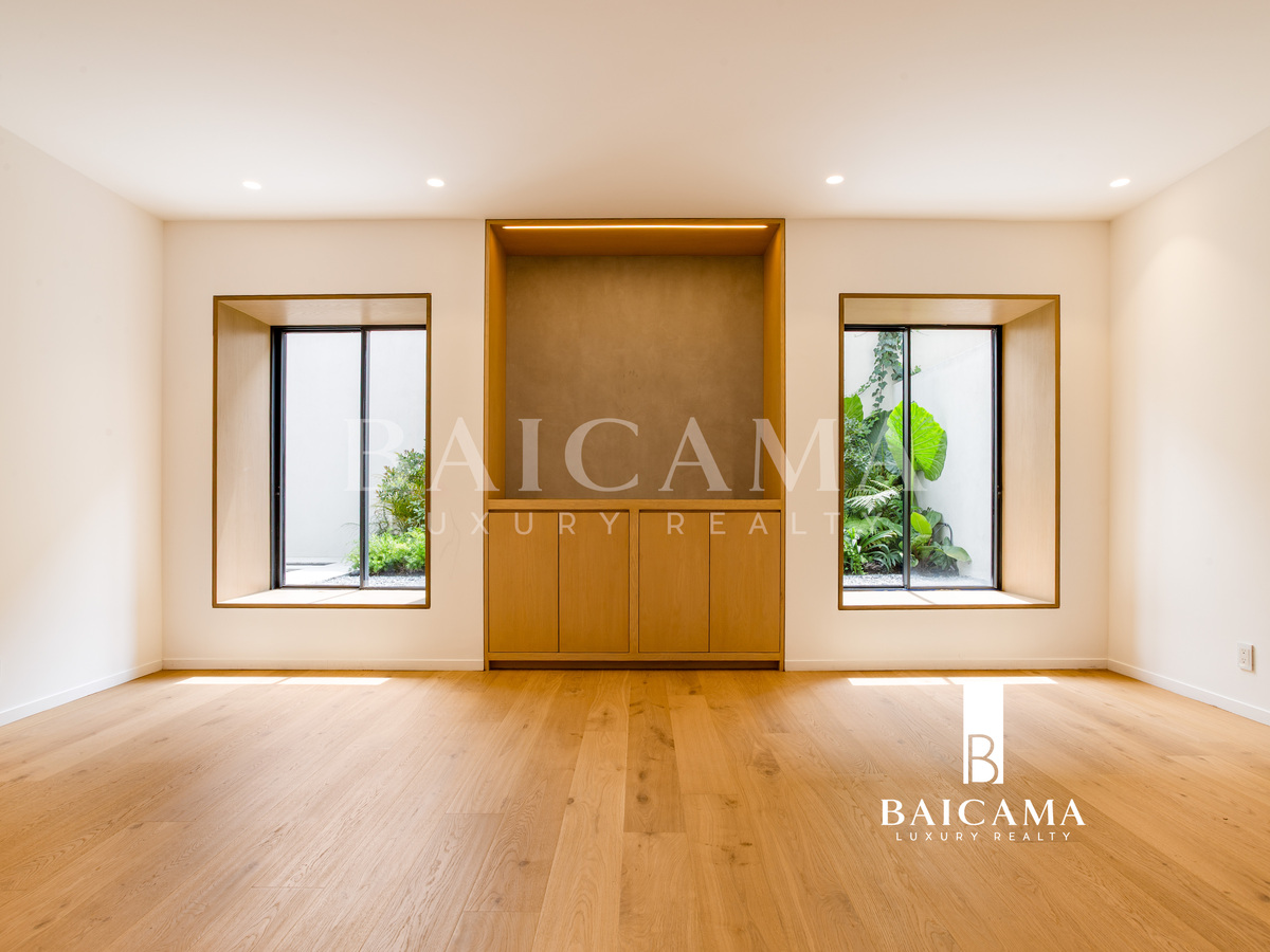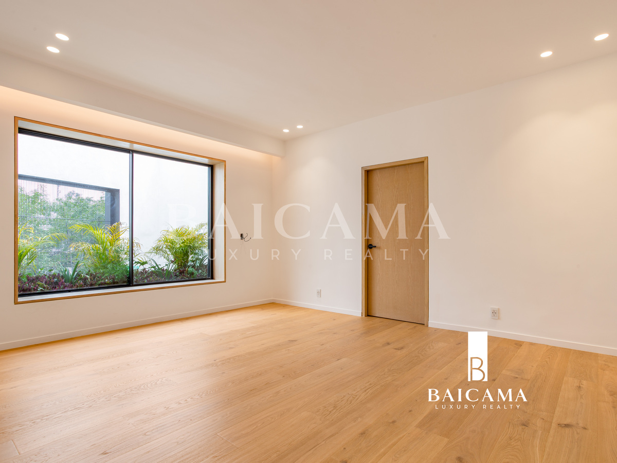 Upon entering, a bright foyer leads to spacious social areas with views of the garden and extraordinary landscaping. The kitchen is equipped with high-end appliances and premium finishes, designed for culinary enthusiasts.