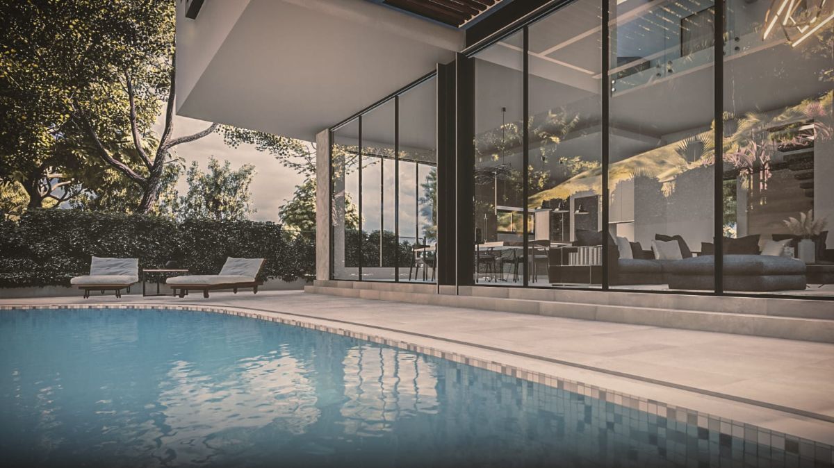 Ground Floor: Hall, 1 Bedroom with full bathroom or study, Kitchen equipped with granite and hot tower, Living Room, Dining Room, Roofed Terrace, Garden with Grill, 3 x 6.50 Heated Pool, Carbon Steel Staircase with