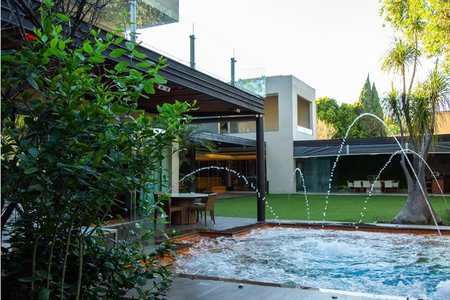 En la entrada principal de la casa te recibe un espejo de agua y una puerta de madera de roble blanco en doble altura con techos de cristal.