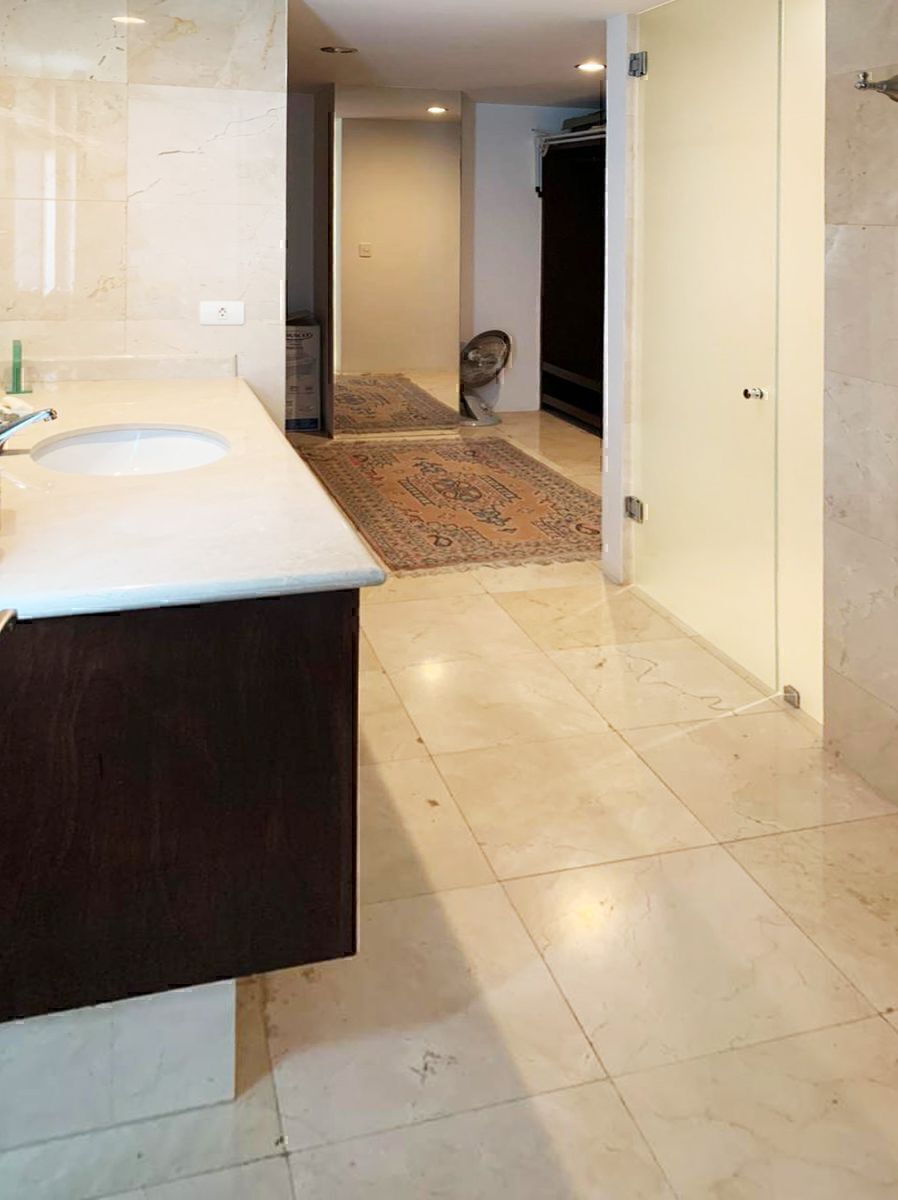 Three bedrooms with walk-in closet each, three full bathrooms, one half bathroom for guests.