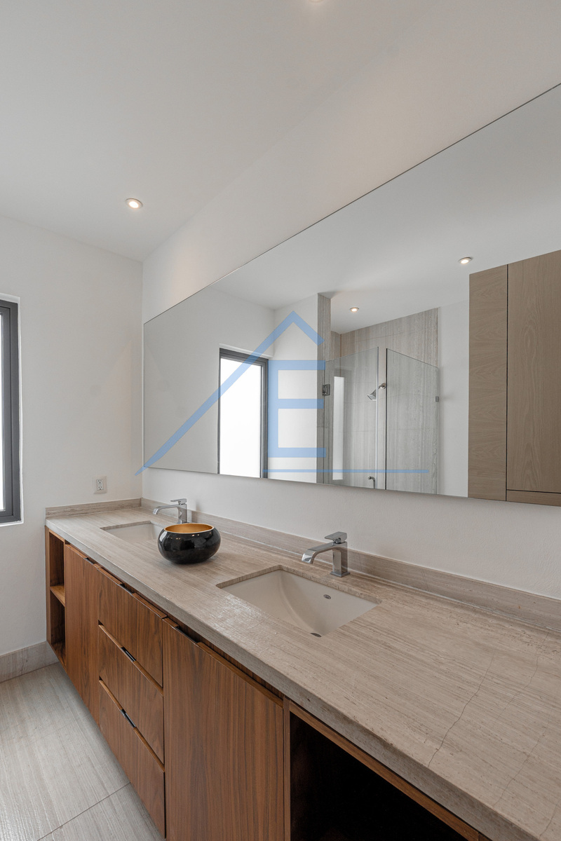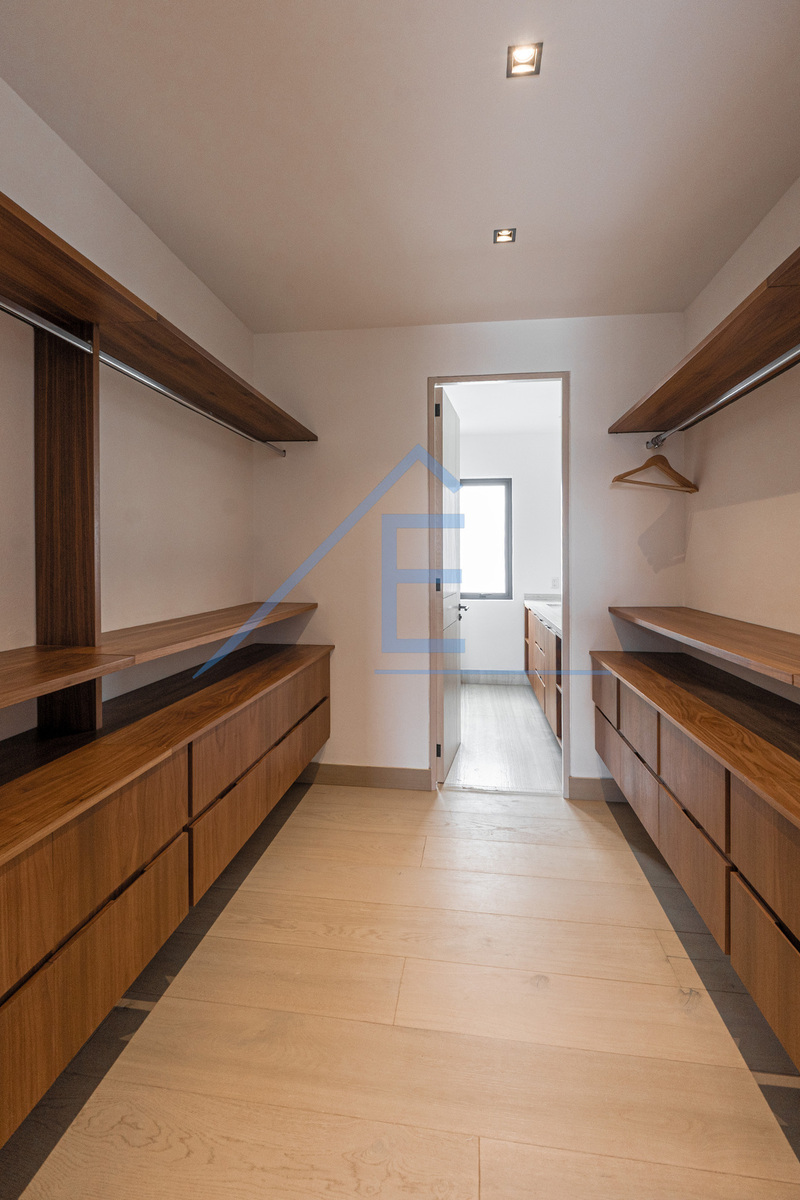 La carpintería de los closets y muebles empotrados de baño es madera de nogal y las cubiertas son de mármol .