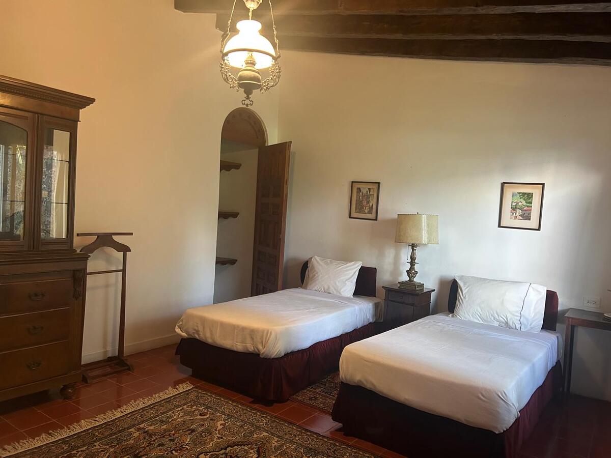 Habitación con dos camas individuales, chimenea, baño completo y balcón.