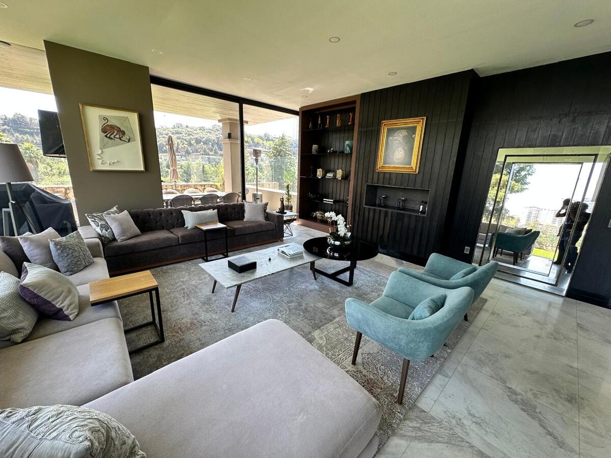 Espaciosa sala y comedor con techos de doble altura y pisos de mármol premium.