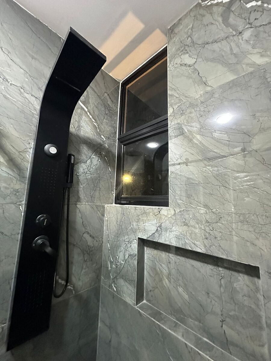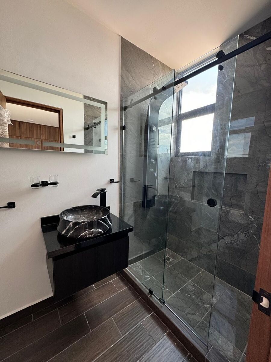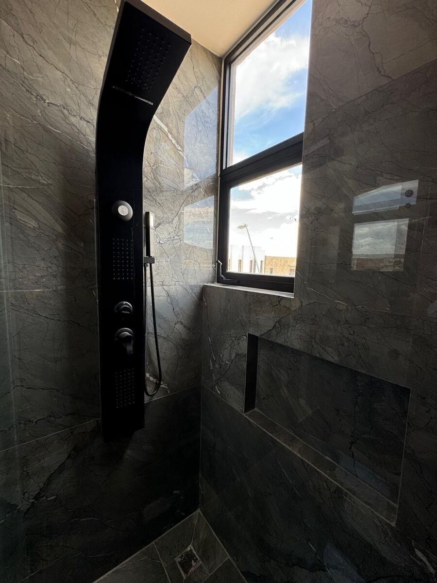 Todos los baños tienen espejo touch con 3 tonos de luz, regadera con hidromasaje, función cascada y bocina bluetooth. Se entrega junto con candil de LED moderna de 5 aros al igual que en el comedor cuenta con lámpara colgante moderna de LED, las dos con control remoto.