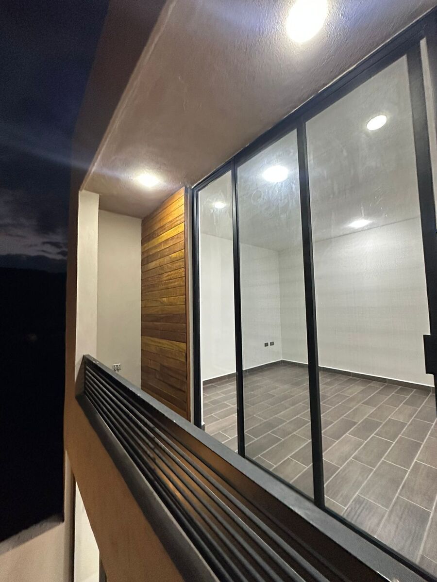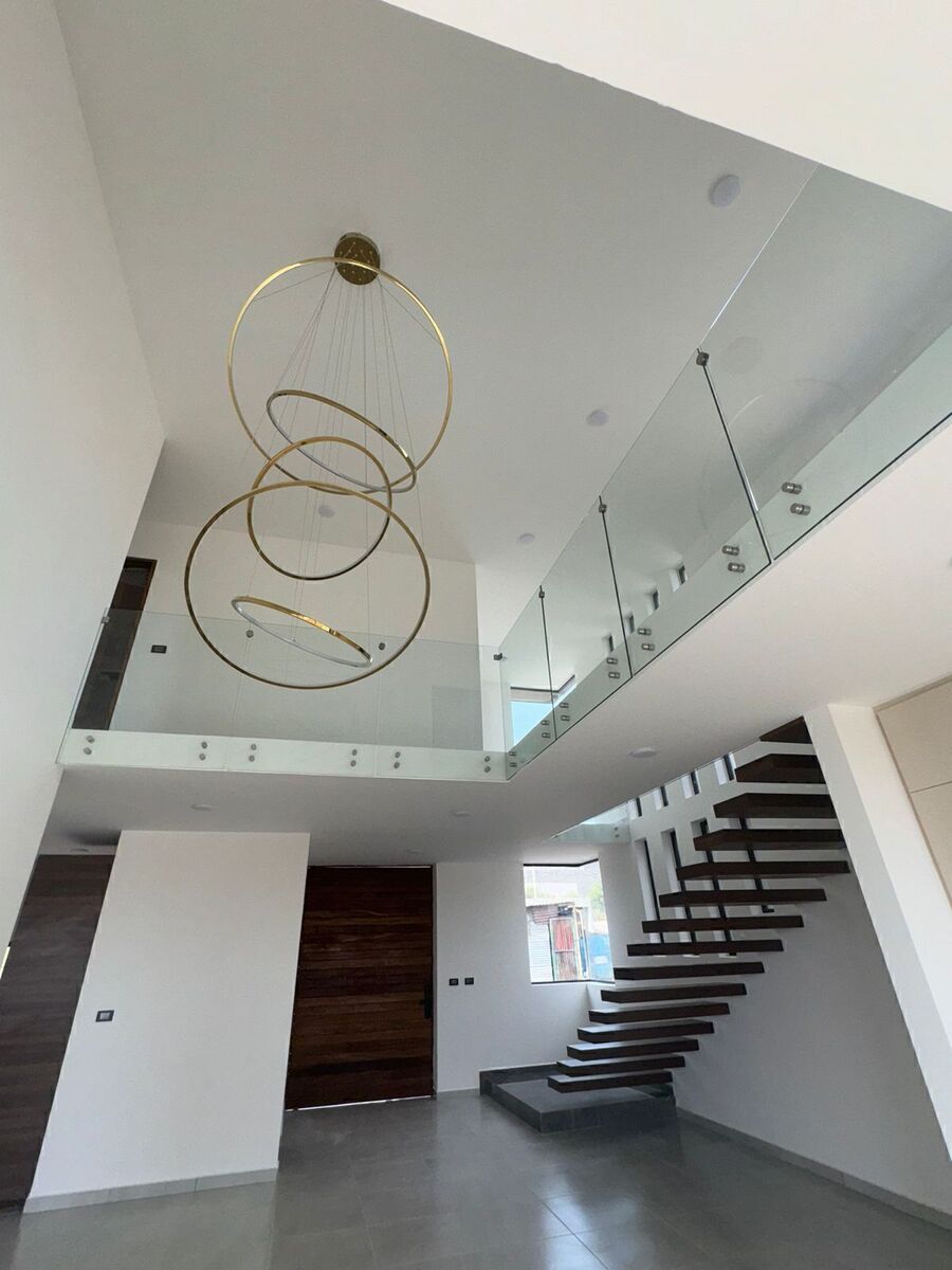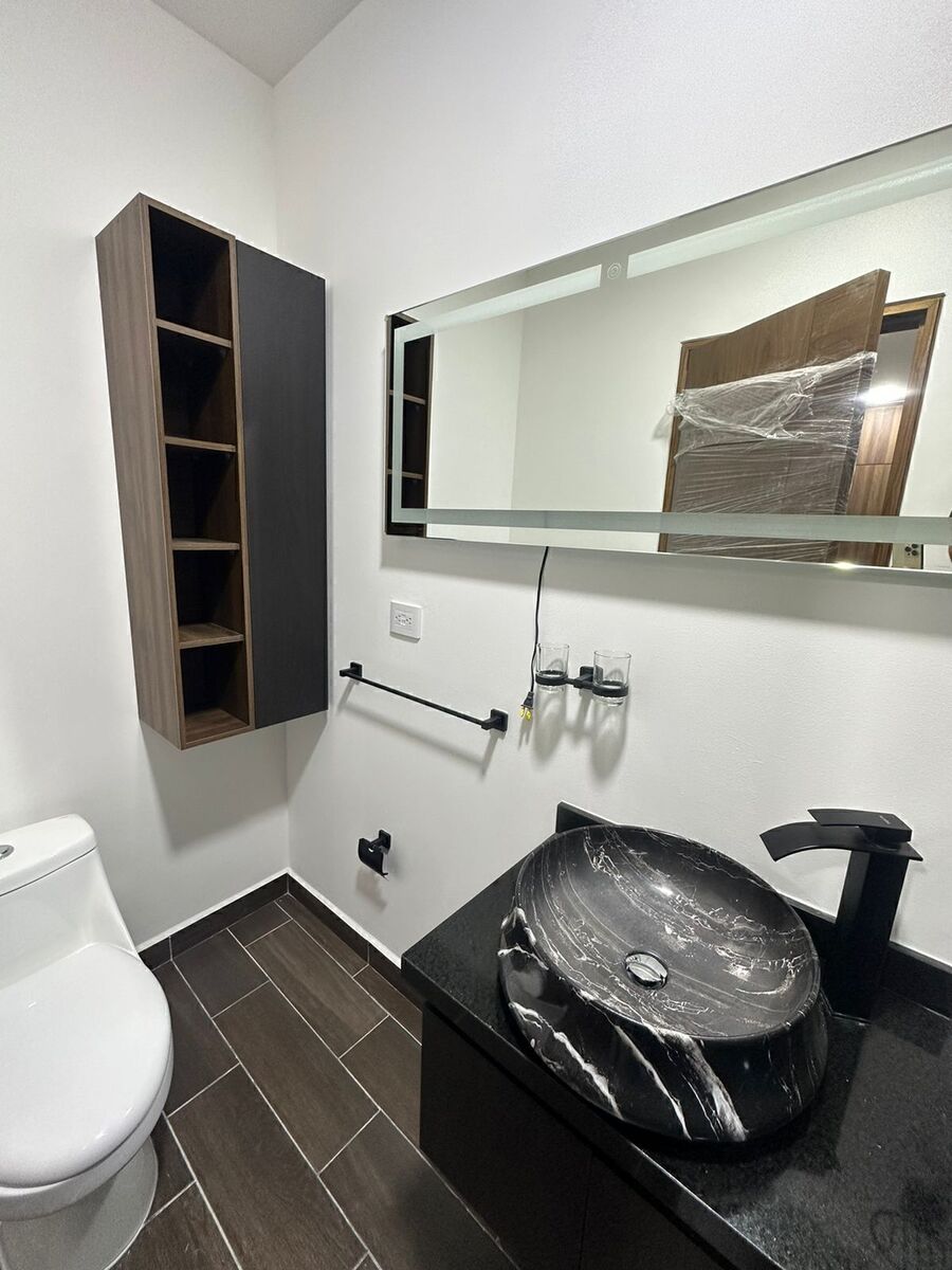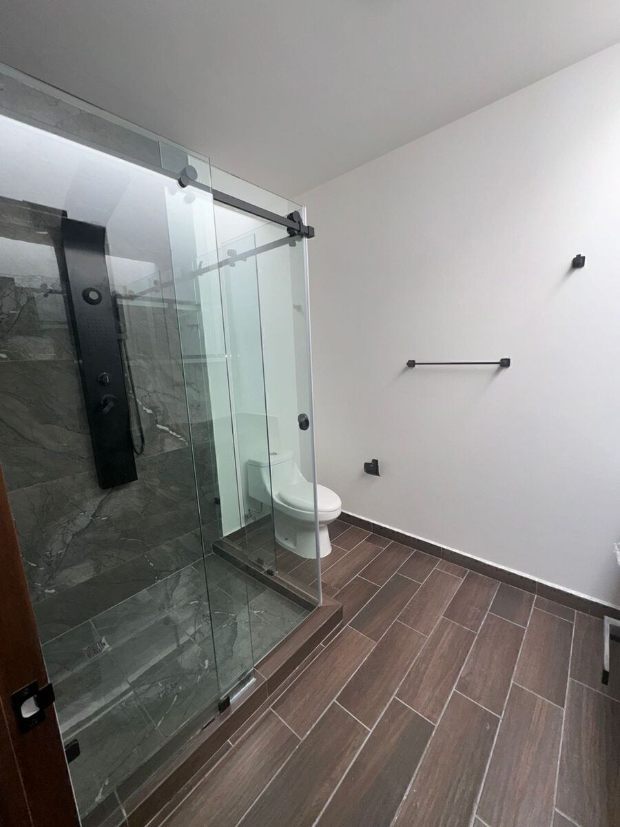 Todos los baños tienen espejo touch con 3 tonos de luz, regadera con hidromasaje, función cascada y bocina bluetooth. Se entrega junto con candil de LED moderna de 5 aros al igual que en el comedor cuenta con lámpara colgante moderna de LED, las dos con control remoto.