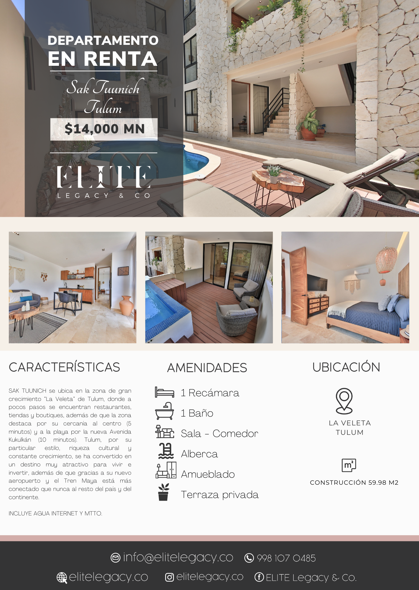 Departamento nuevo, completamente amueblado y decorado, de una recámara con terraza y plunge pool privados en SAK TUUNICH, un exclusivo edificio de 6 departamentos construido con materiales de la región, elegidos con delicadeza y cuidando cada detalle. Es una fusión entre la arquitectura de lujo y la belleza de la naturaleza mexicana con una atmósfera de tranquilidad, un lugar ideal para vivir en paz y armonía.