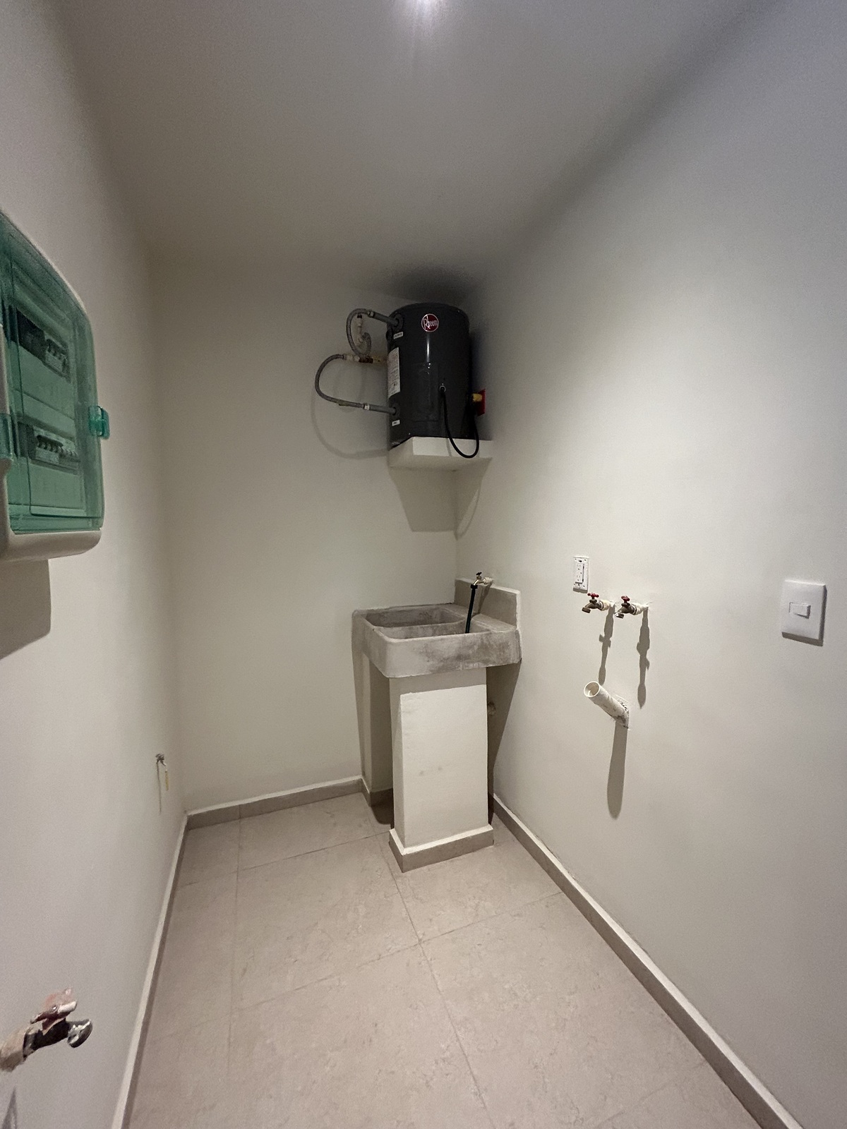 Área de lavado con batea, calentador de agua eléctrico y espacio para lavadora.