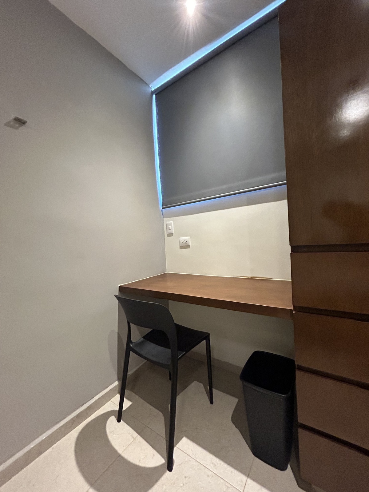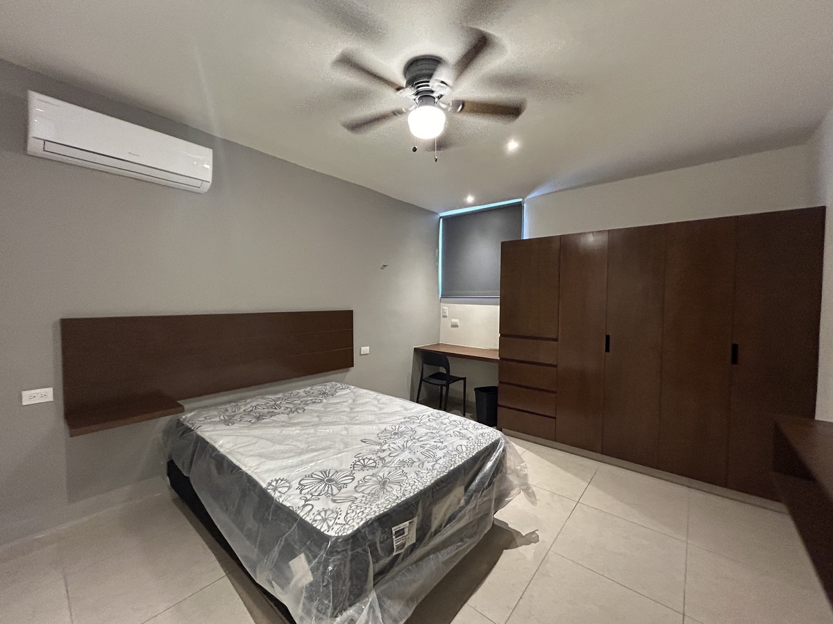 Recámara principal con cama matrimonial, clóset, meseta de trabajo, ventilador, minisplit