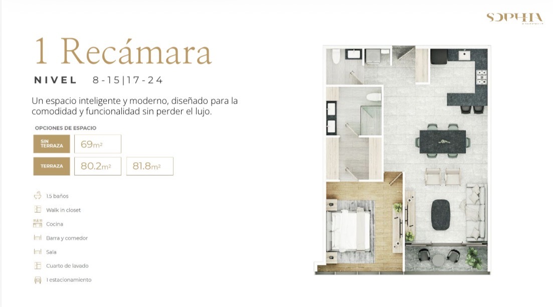 • Distribución: 1.5 baños, walk-in closet, cocina, barra-comedor, sala, cuarto de lavado y 1 cajón de estacionamiento