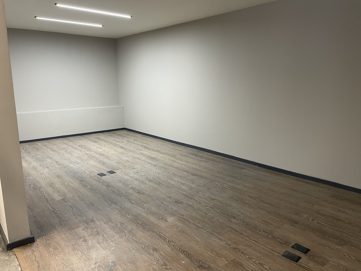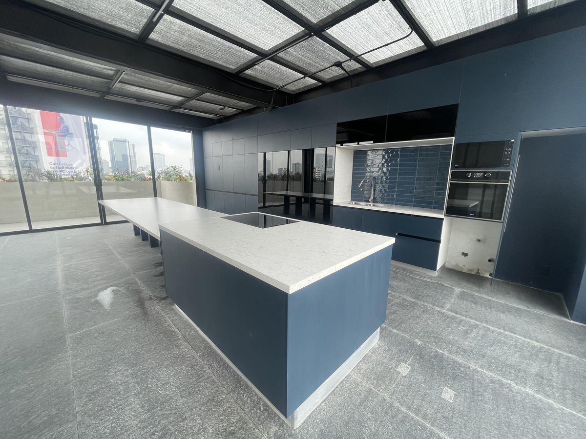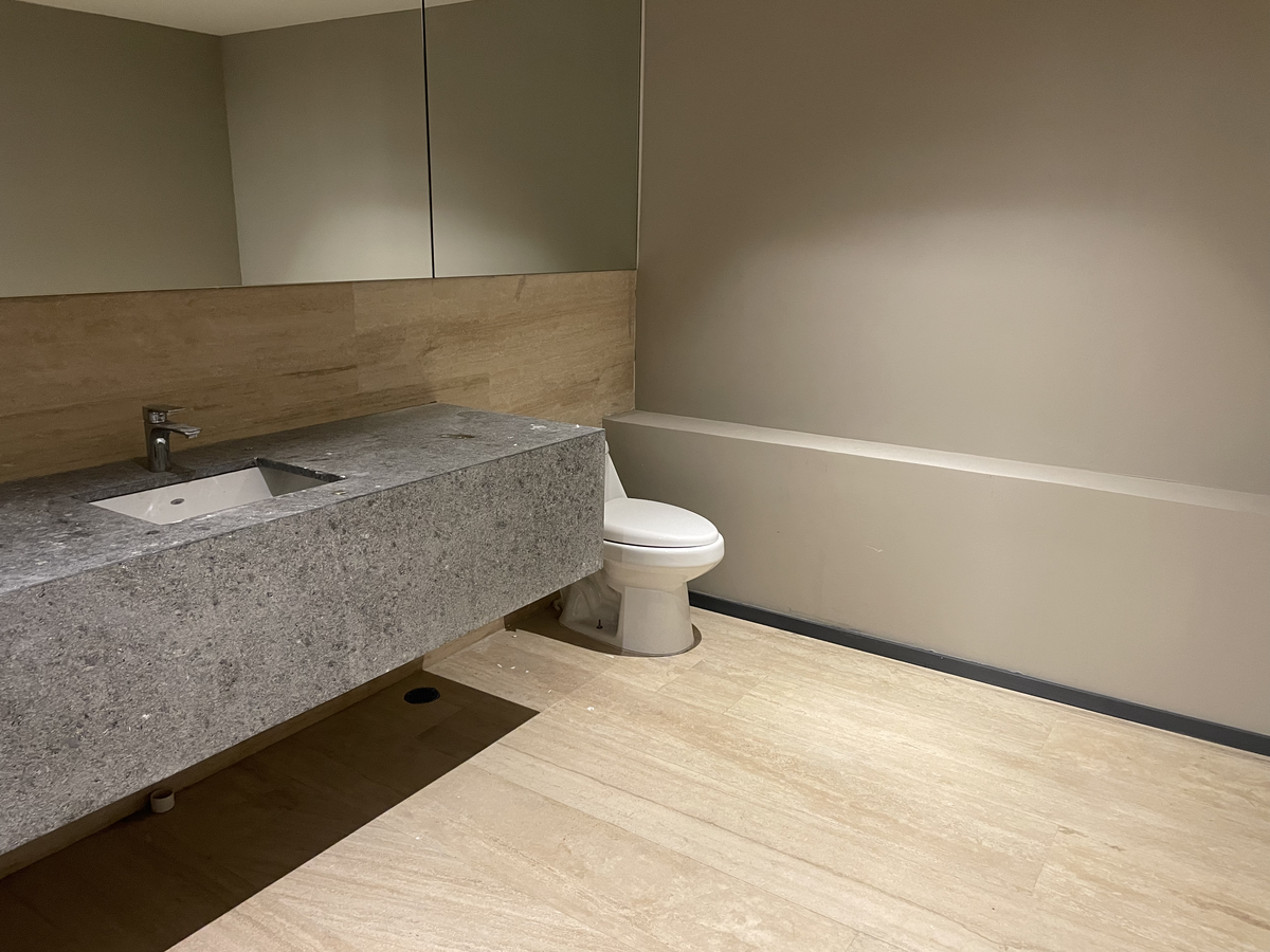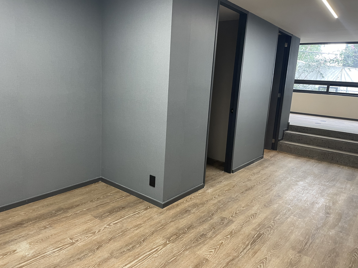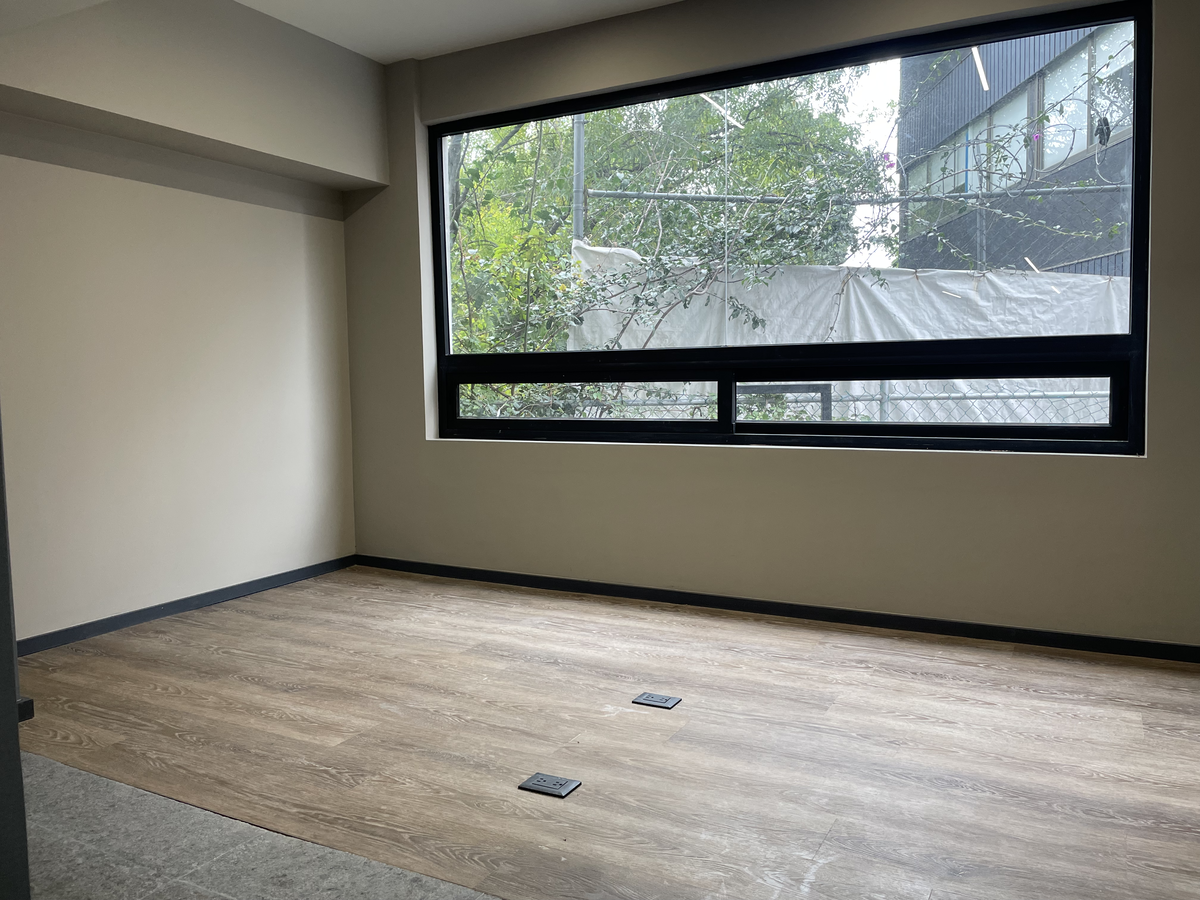 Estudio con buena iluminación, es exterior, cuenta con cocina integral, estufa eléctrica y tarja. Pisos laminados, azulejos en paredes de baños y piso de mármol, puerta de vidrio templado. Mármol gris en lavabo.