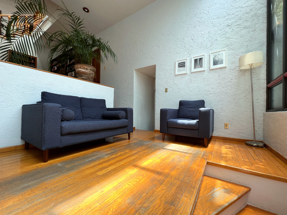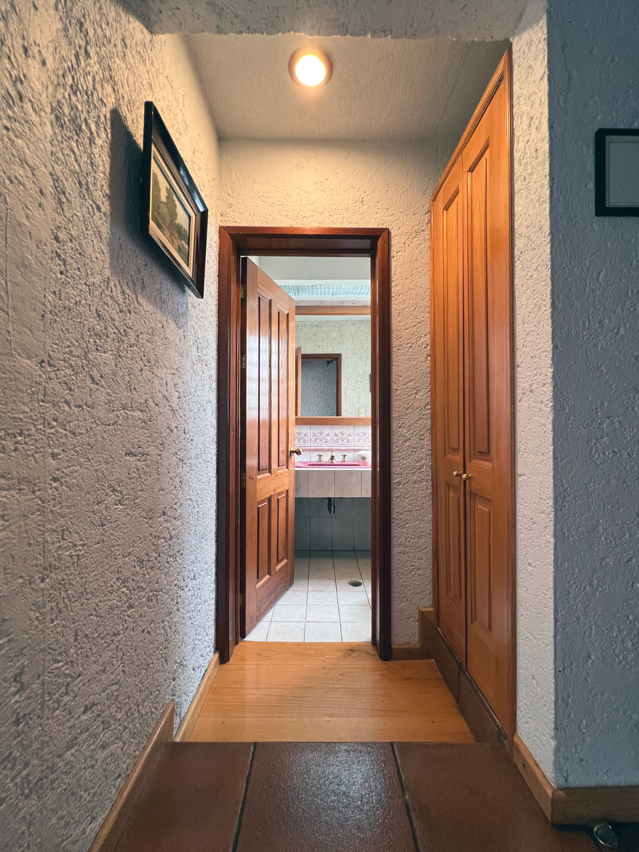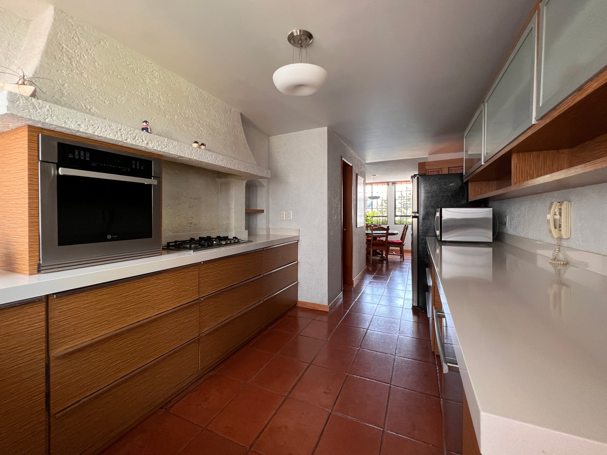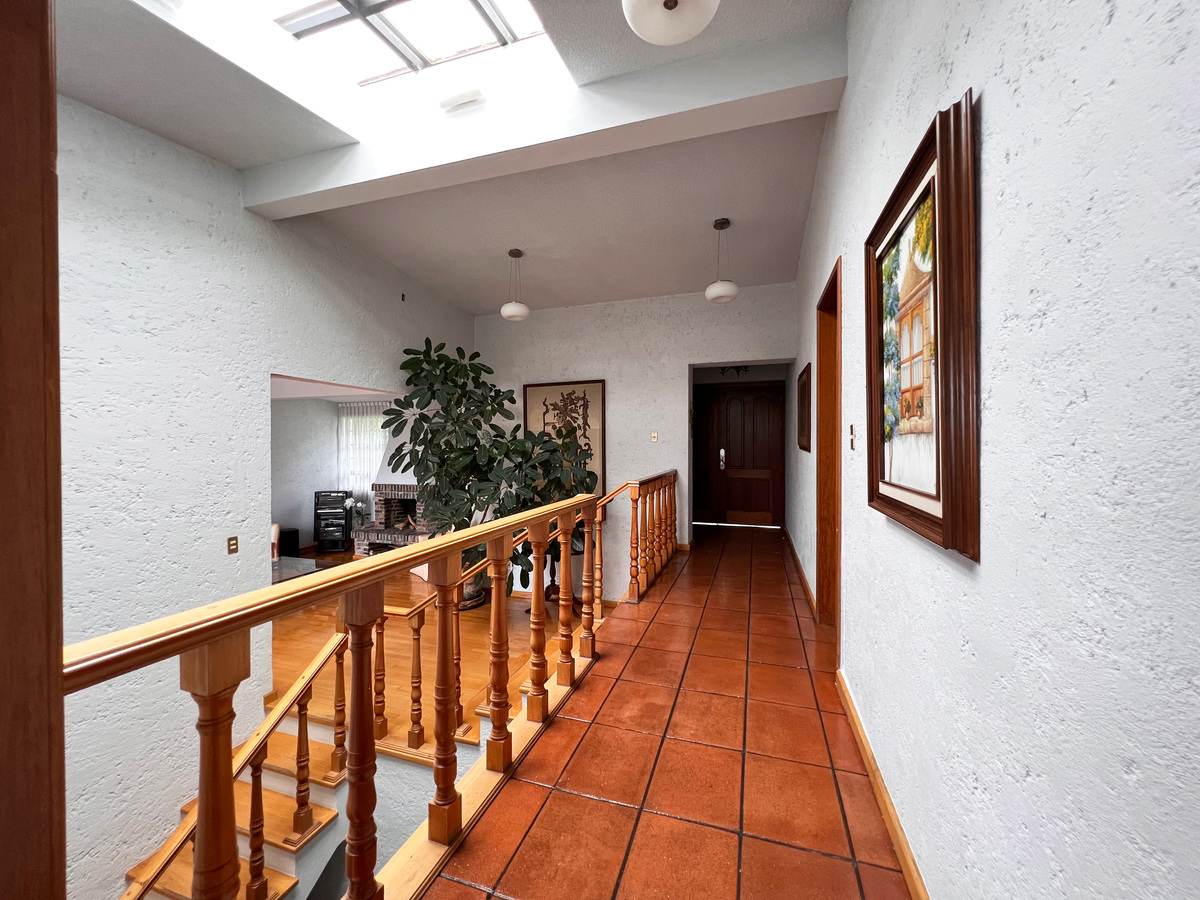 En el primer nivel está cocina con antecomedor, medio baño de visitas, clóset de abrigos y comedor. La cocina es tipo integral, remodelada hace apenas unos años. Unos escalones abajo está su amplia sala, con chimenea. Esta zona tiene salida a una agradable terraza para disfrutar de un rato al aire libre.