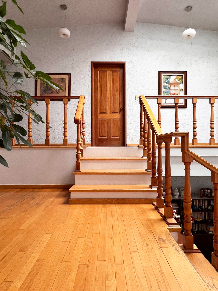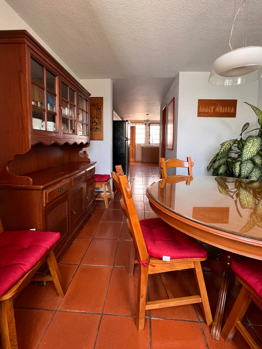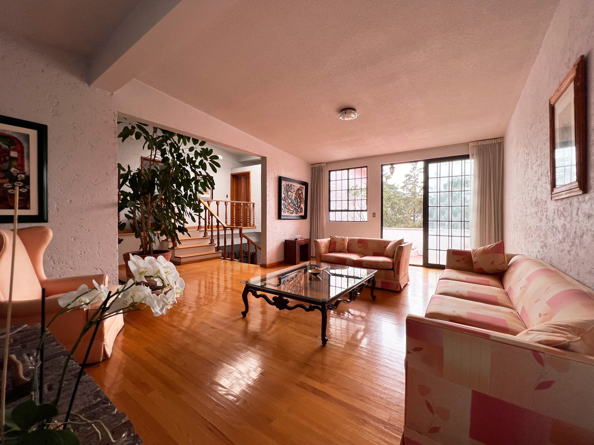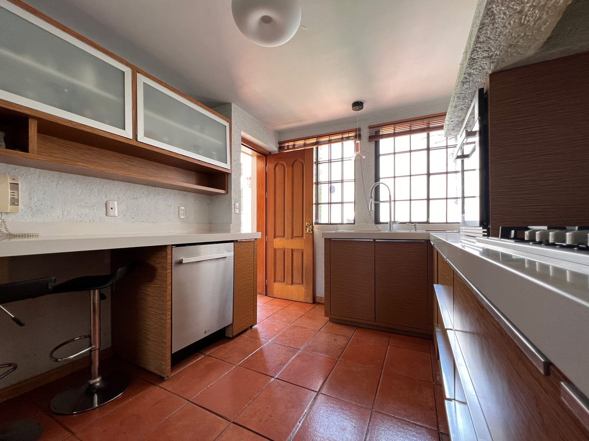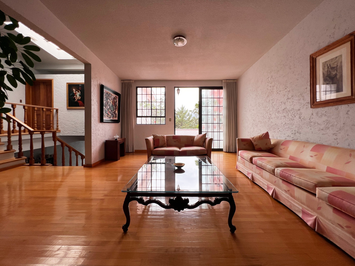 En el primer nivel está cocina con antecomedor, medio baño de visitas, clóset de abrigos y comedor. La cocina es tipo integral, remodelada hace apenas unos años. Unos escalones abajo está su amplia sala, con chimenea. Esta zona tiene salida a una agradable terraza para disfrutar de un rato al aire libre.