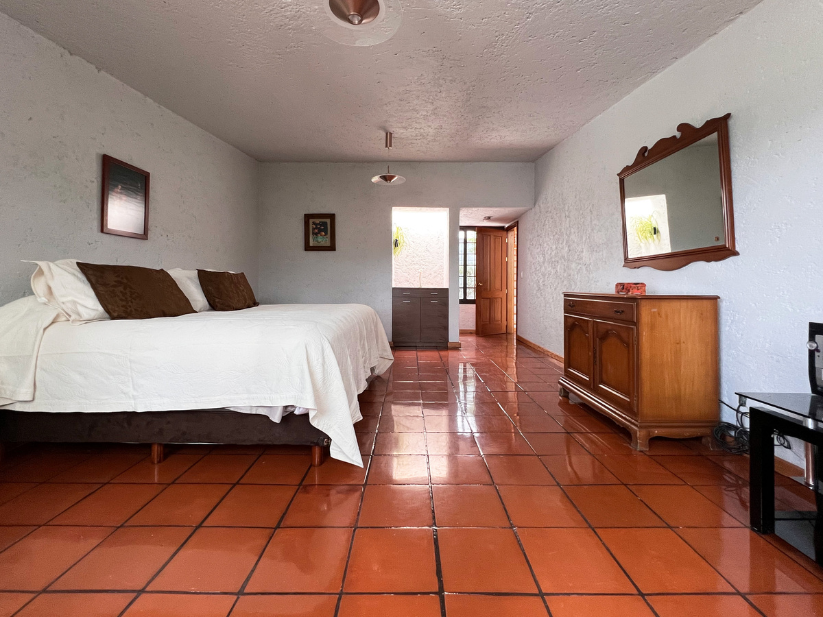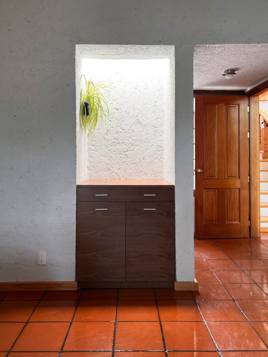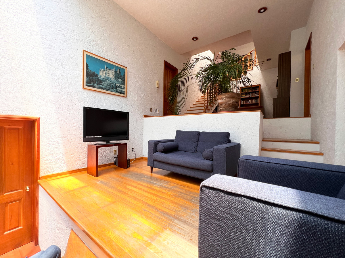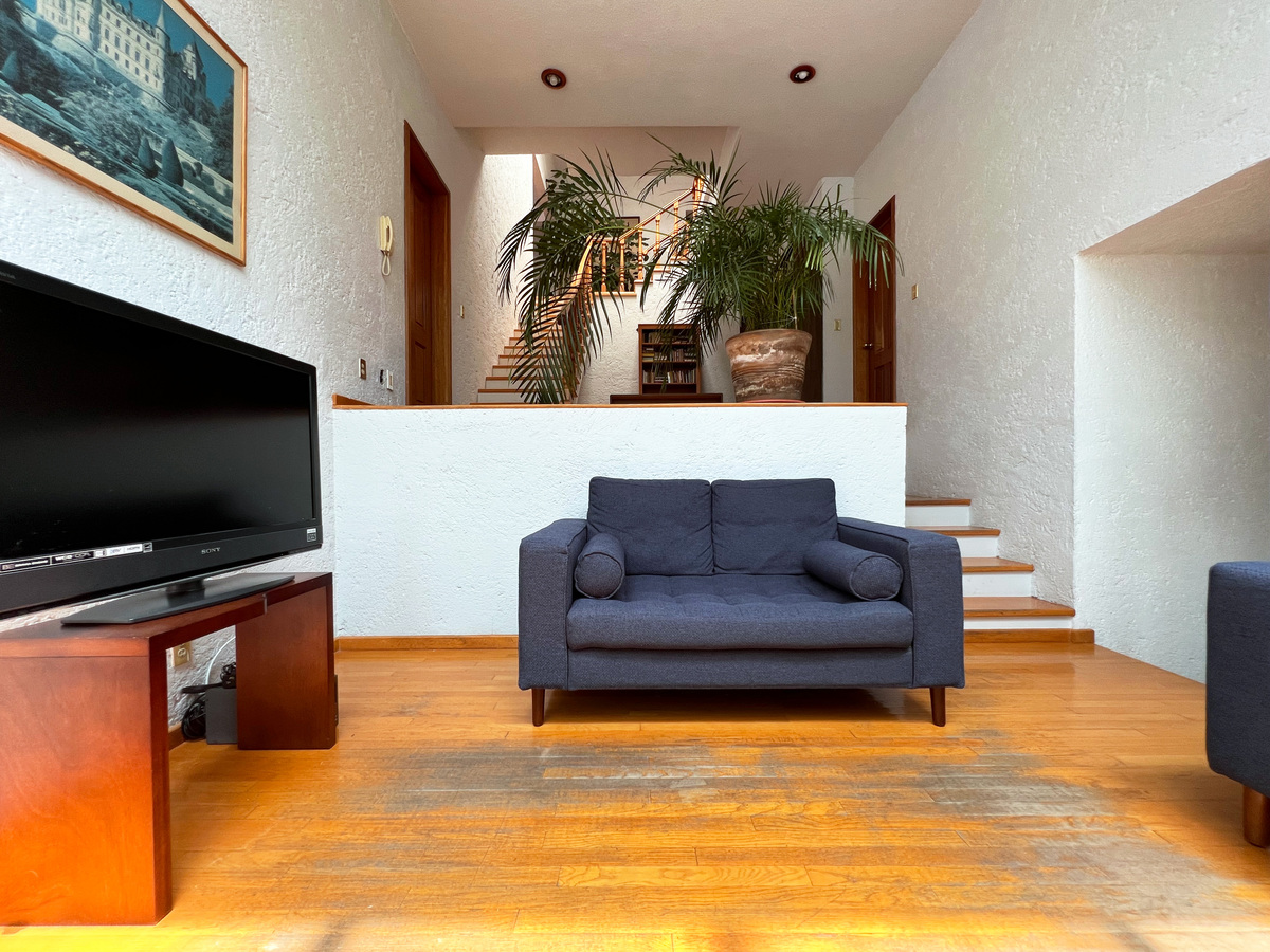 Medio nivel abajo hay un área que se utiliza como sala de TV. En este nivel está también la tercer recámara, también con su baño y vestidor. Ademas tenemos un espacio de taller u oficina.