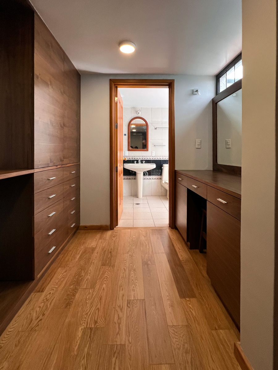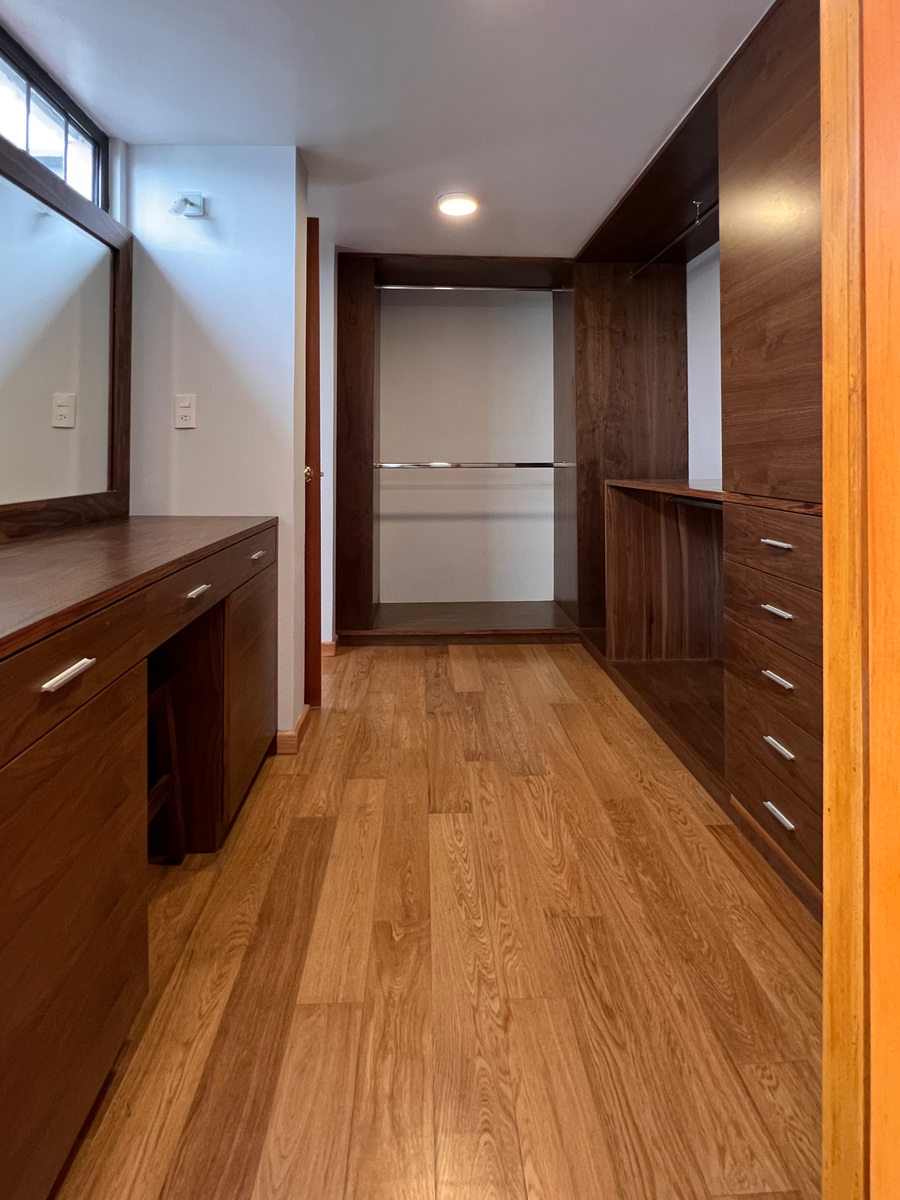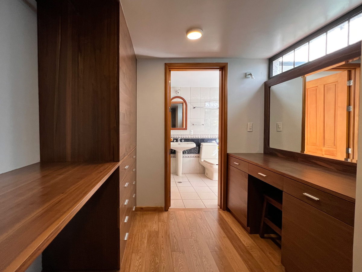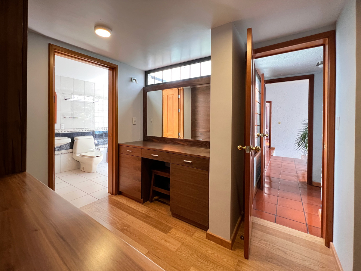 Un piso abajo están 2 recámaras, la principal y una de las secundarias, ambas con clóset vestidor y su baño completo. En este nivel está un área abierta tipo biblioteca.