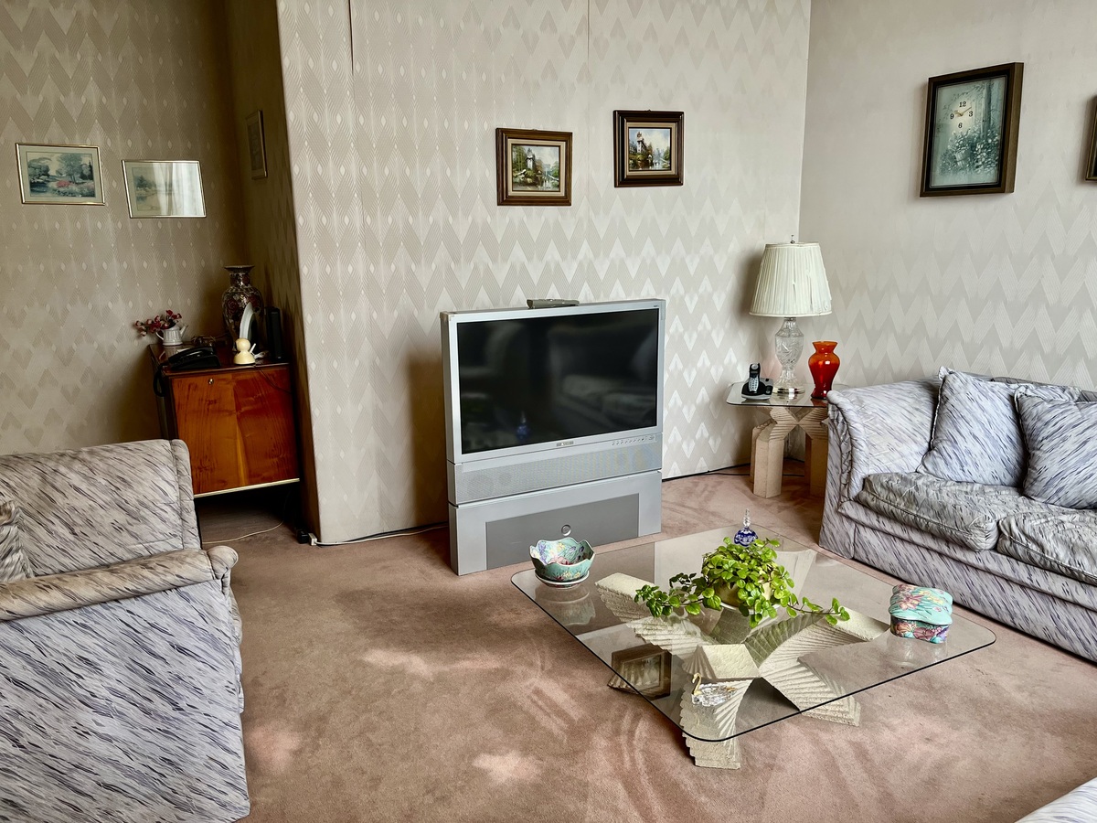 En un medio nivel hacia arriba está la sala de televisión muy iluminada.