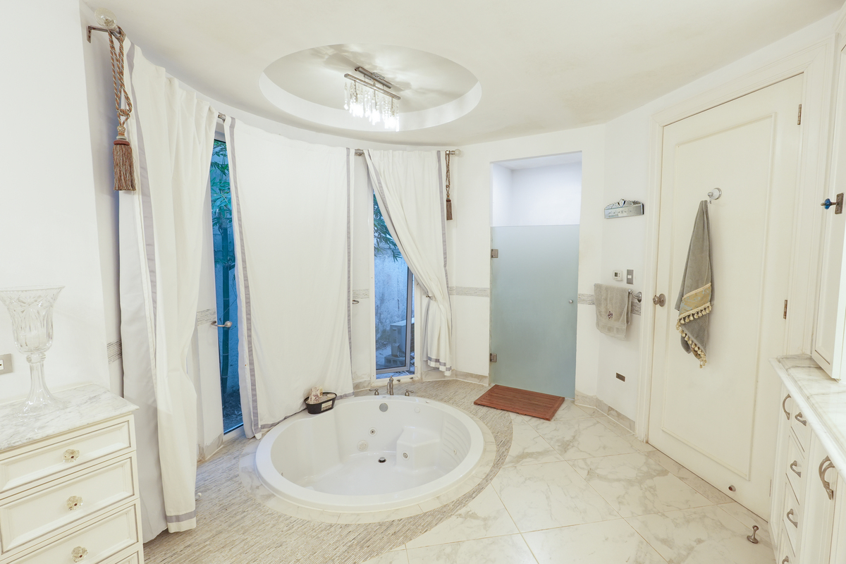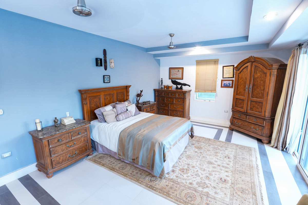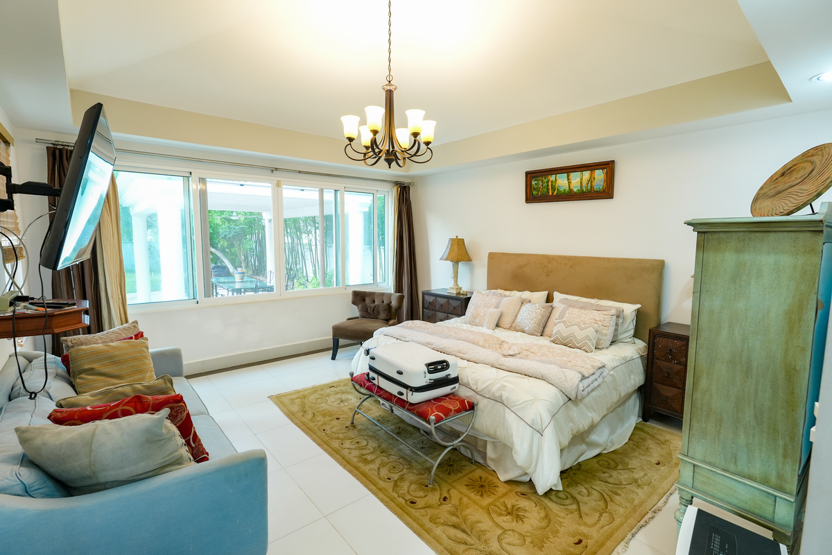 • Master bedroom (Room 1): very spacious, with full bathroom, jacuzzi, two walk-in closets (ladies' and men's), windows leading to the garden and views of the pool
