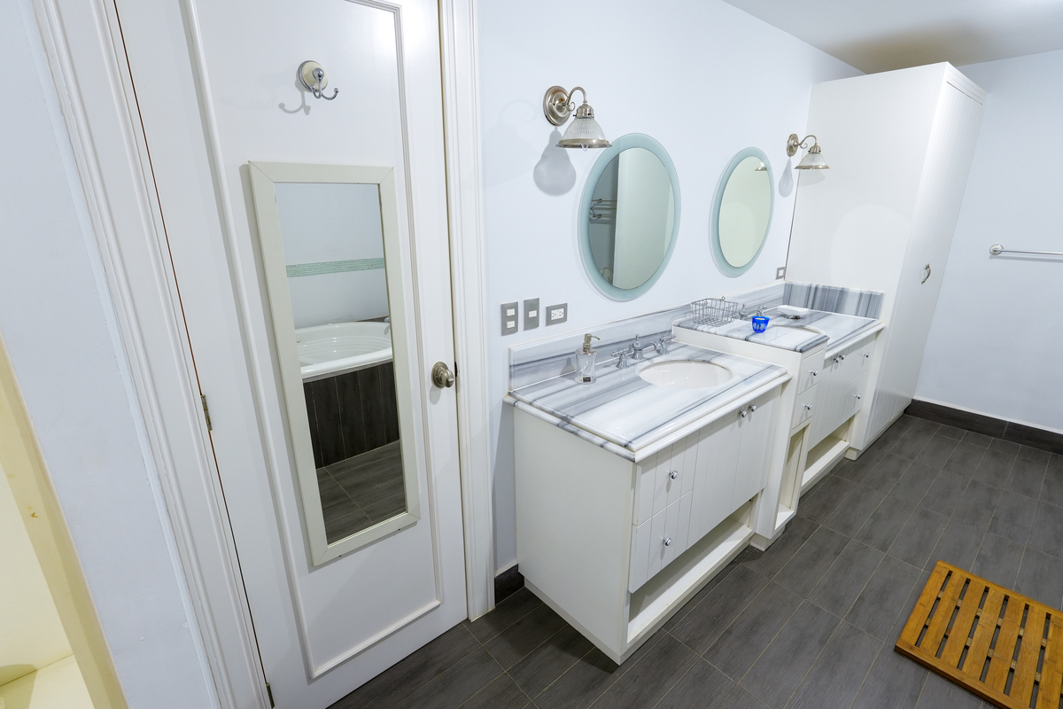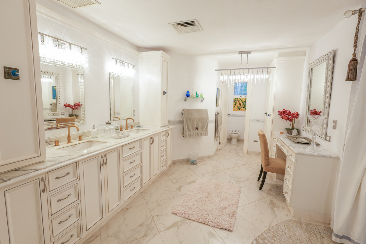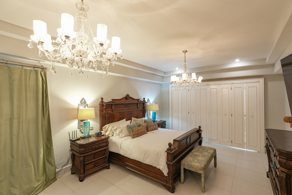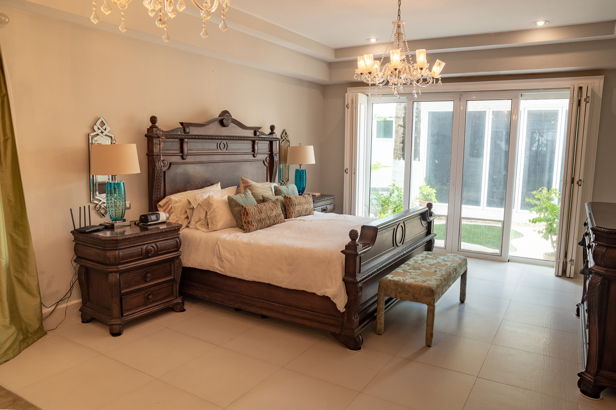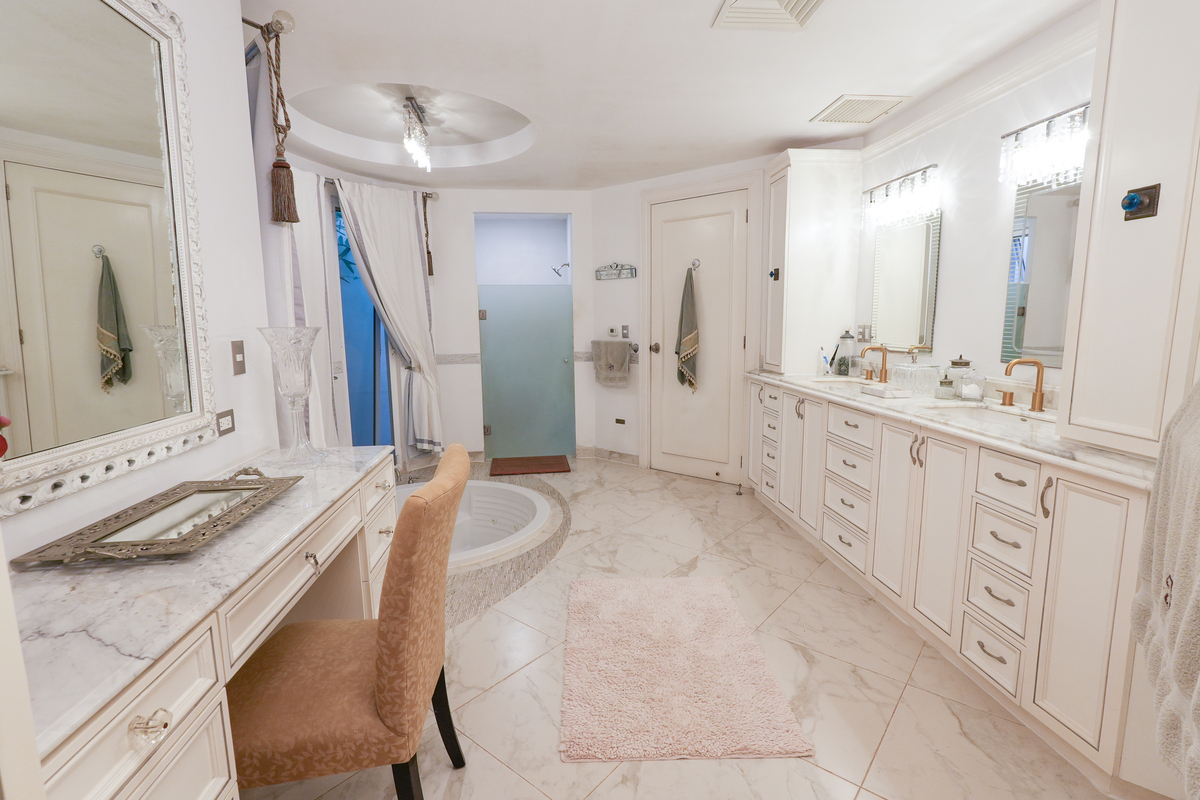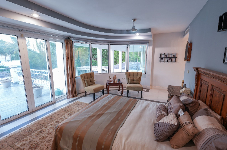 • Master bedroom (Room 1): very spacious, with full bathroom, jacuzzi, two walk-in closets (ladies' and men's), windows leading to the garden and views of the pool