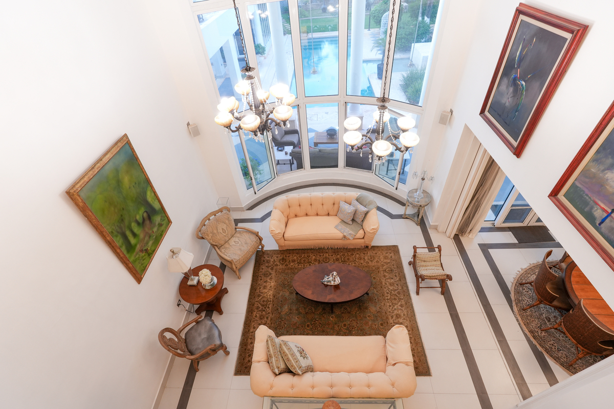 • Gran sala principal con ventanales de doble altura y vistas al jardín