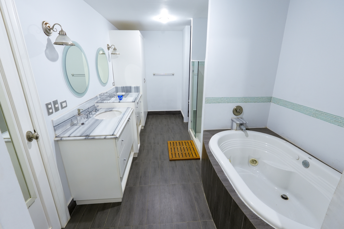 • Recámara principal (Habitación 1): muy amplia, con baño completo, jacuzzi, dos vestidores (dama y caballero), ventanales con salida al jardín y vistas a la piscina