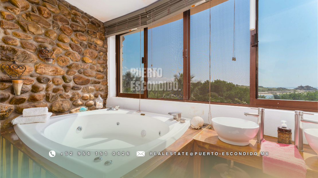 La casa principal de 3 niveles cuenta con 3 recámaras, cada una con baño privado y aire acondicionado. La recámara principal dispone de vestidor y jacuzzi, además de una amplia sala, comedor, cocina equipada y una terraza panorámica con impresionantes vistas al mar.