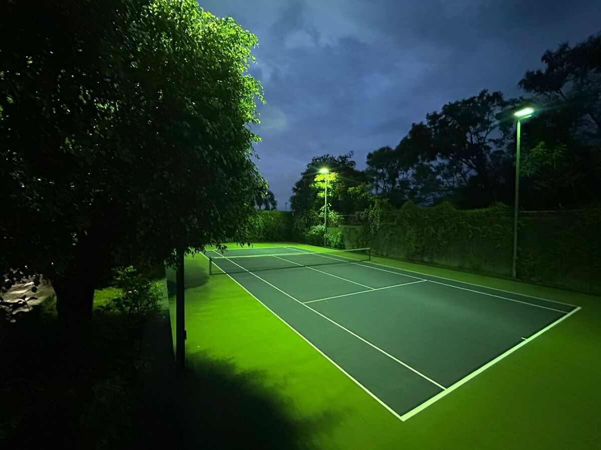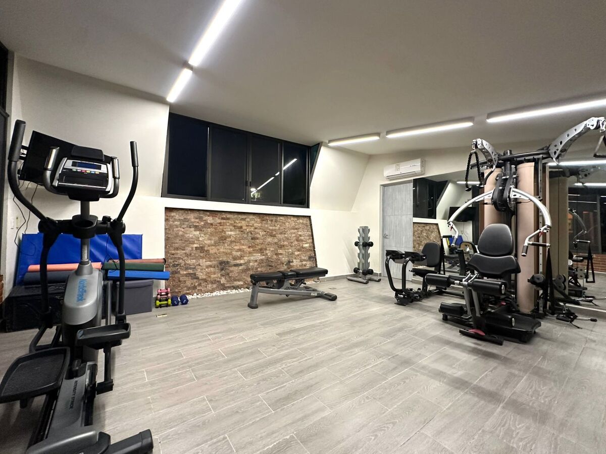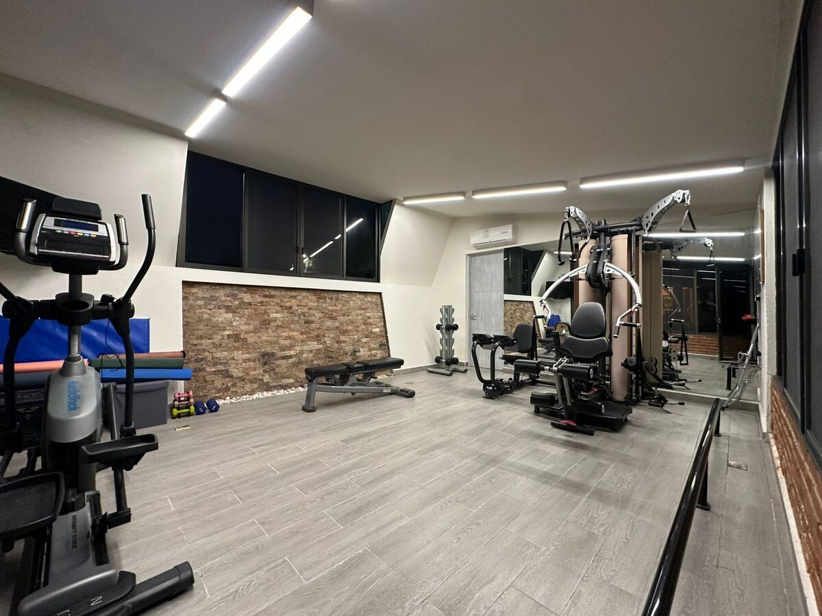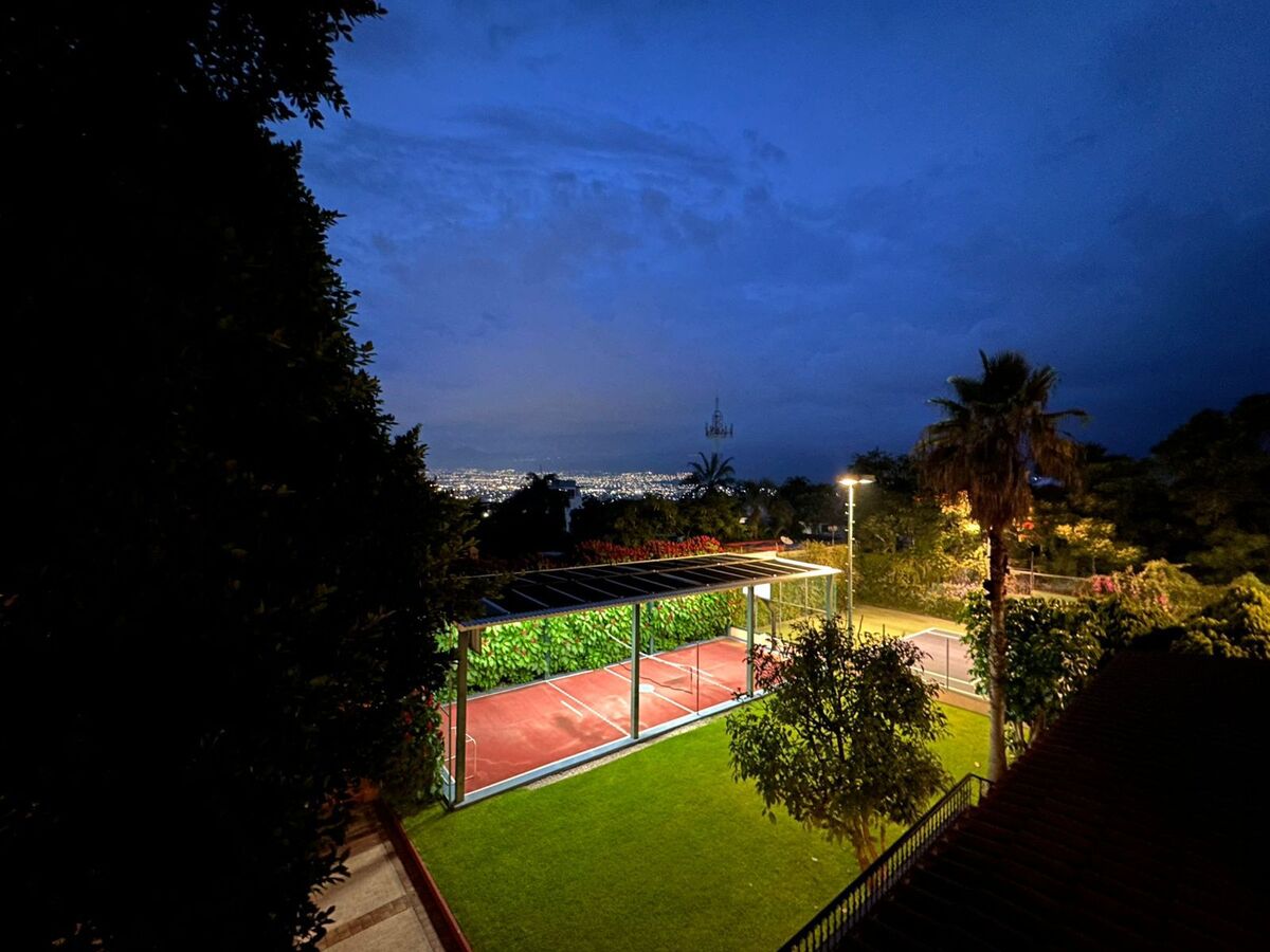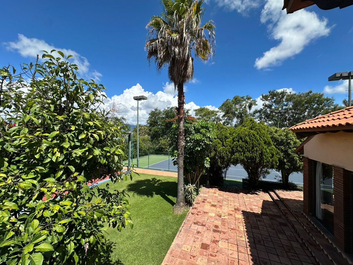 En el exterior, la propiedad destaca por su extenso jardín privado de 3,500 m², alberca, cancha de tenis, cancha de pádel, gimnasio, área de asoleaderos y estacionamiento para seis autos.