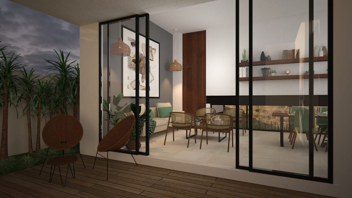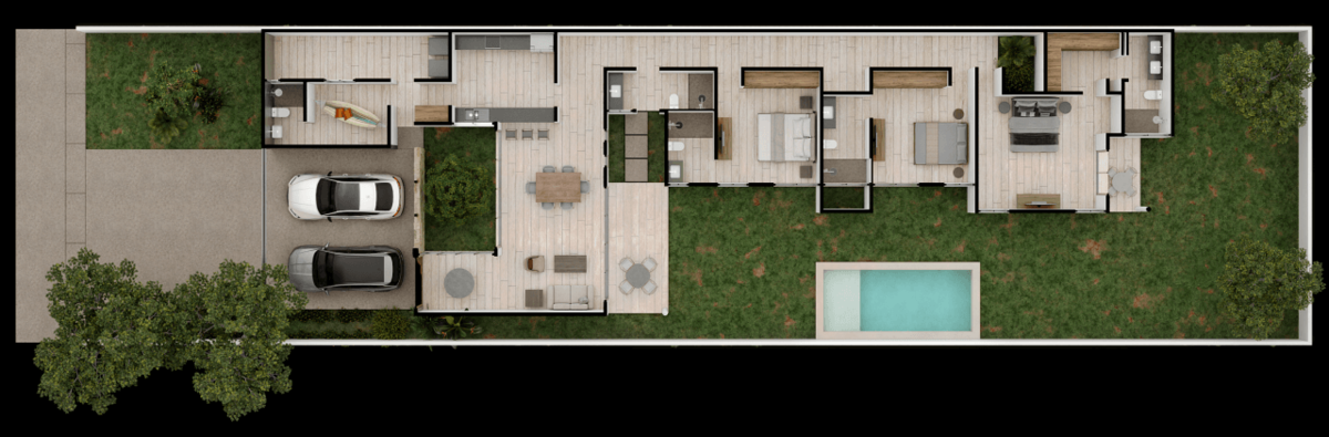 Modelo 1. De Una Planta (305 m² de Construcción): Diseño ideal con Sala/Comedor a altura y media, cocina vestida, 3 recámaras, 5 baños, jardín interior, terraza techada y una refrescante alberca privada. Cochera techada para dos autos.