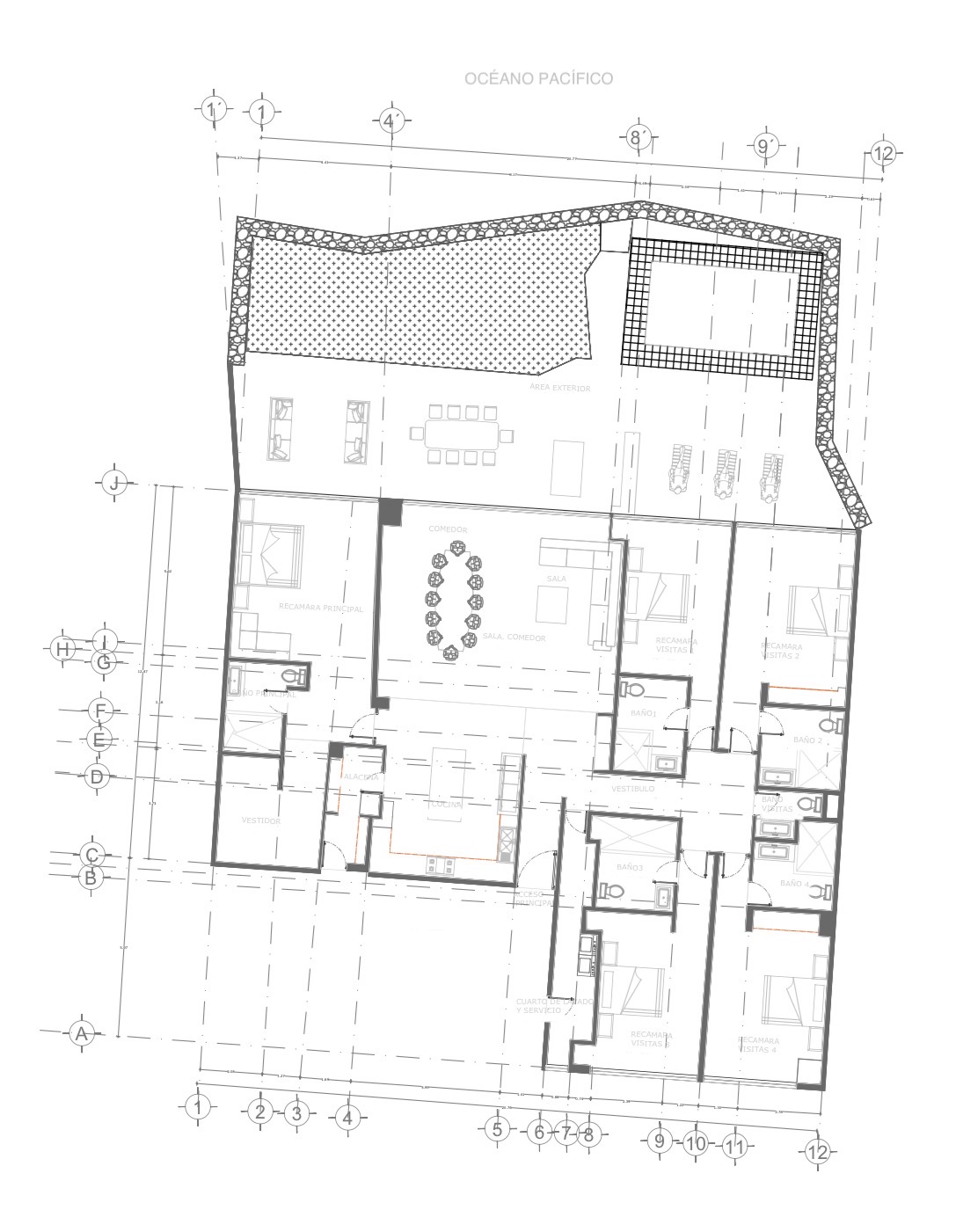 Al exterior es un resort privado: como distintivo, es el único departamento del desarrollo con alberca privada, acabada en piedra Sukabumi importada de Indonesia, deck de madera Cumarú, mini golf, terraza con asador Weber y mobiliario de exterior importado de Grecia. Un entorno rodeado de flora tropical y gran vista al mar.