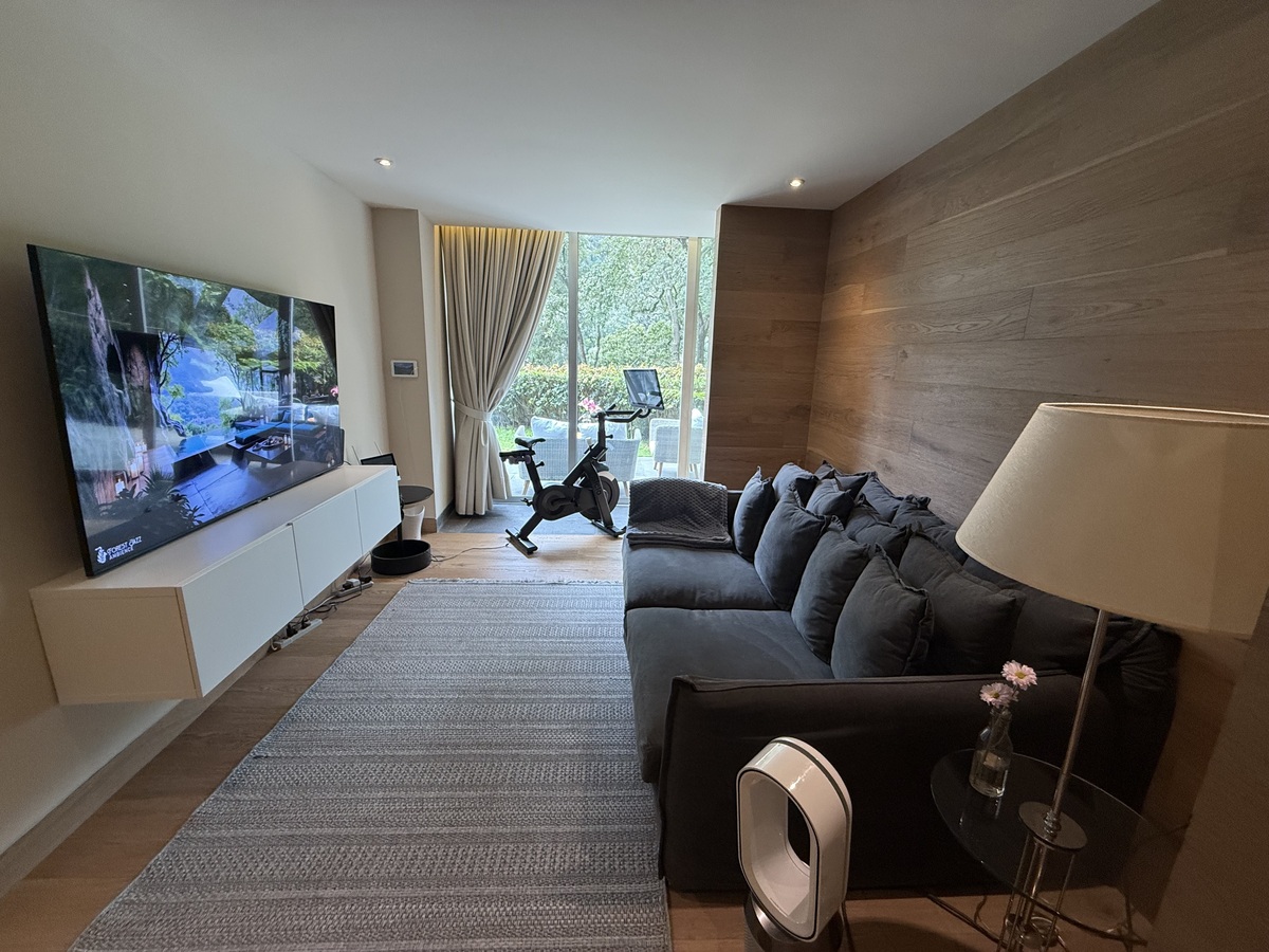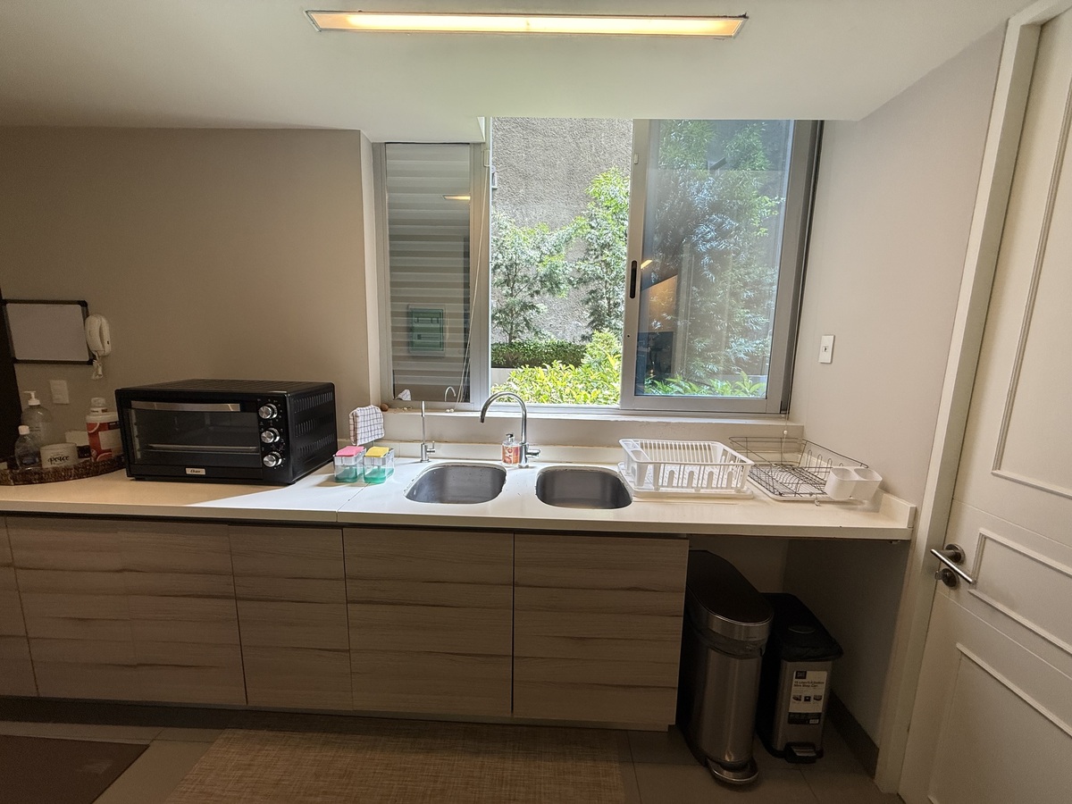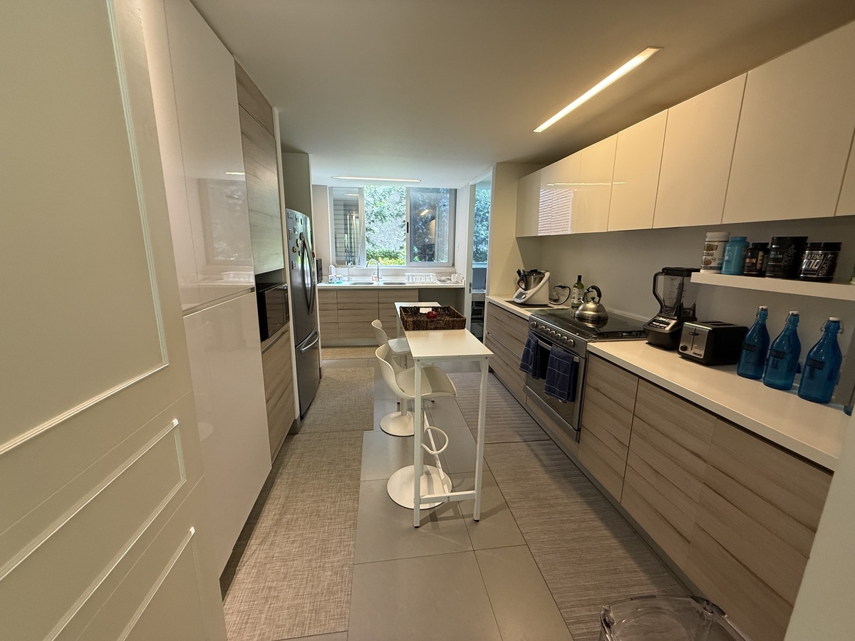 El departamento cuenta con tres recámaras, cada una con su propio walk-in closet y baño completo. La distribución es ideal para disfrutar en familia o recibir visitas con total comodidad: amplia sala, comedor, sala de televisión, cocina integral, baño de visitas, cuarto de lavado y cuarto de servicio con baño completo.