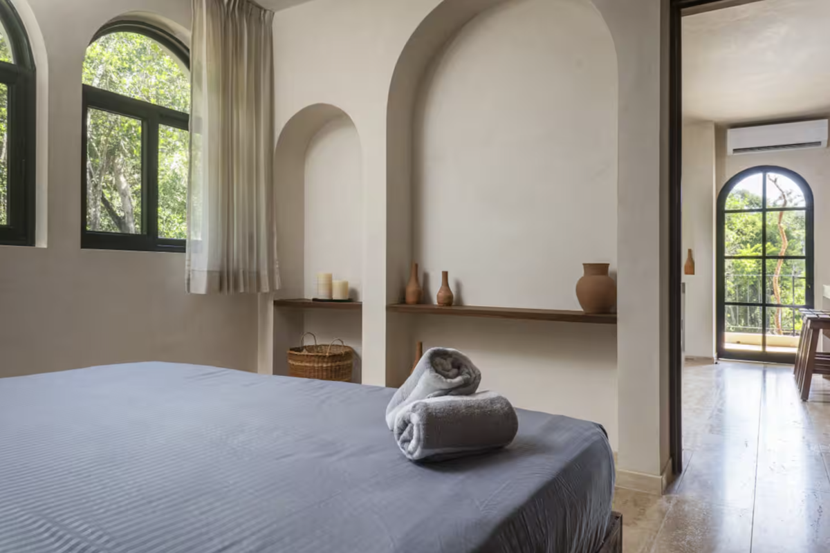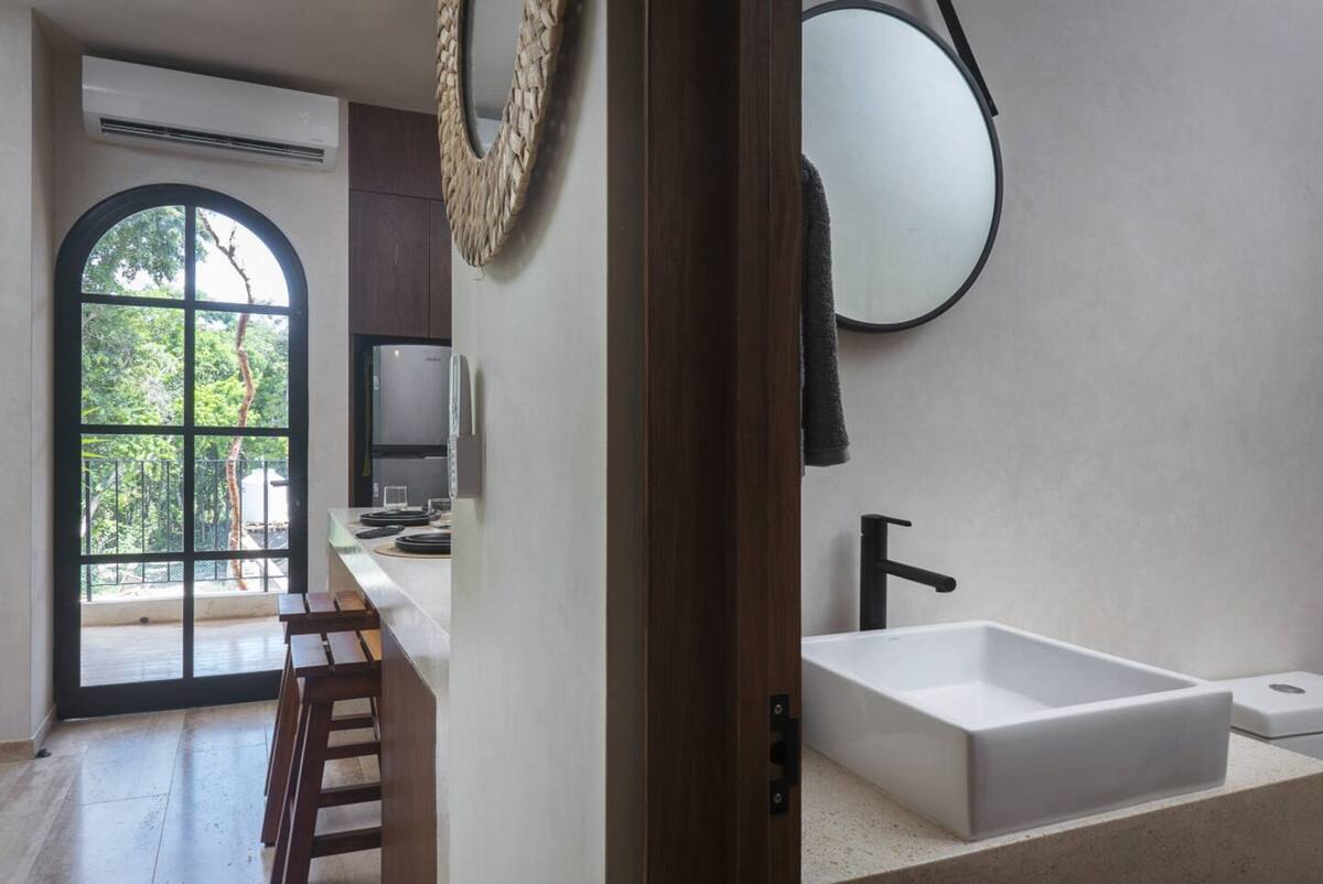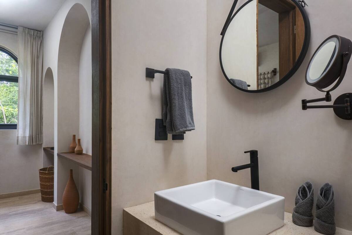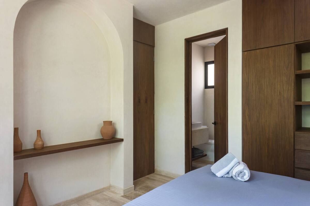 The main bedroom combines comfort and privacy, featuring a closet and full bathroom. High-end finishes, natural materials, and neutral tones reflect Tulum’s authentic style, while large windows fill the interiors with natural light. Every detail has been carefully designed to offer a relaxed, elegant, and functional living experience.