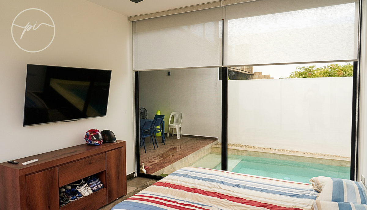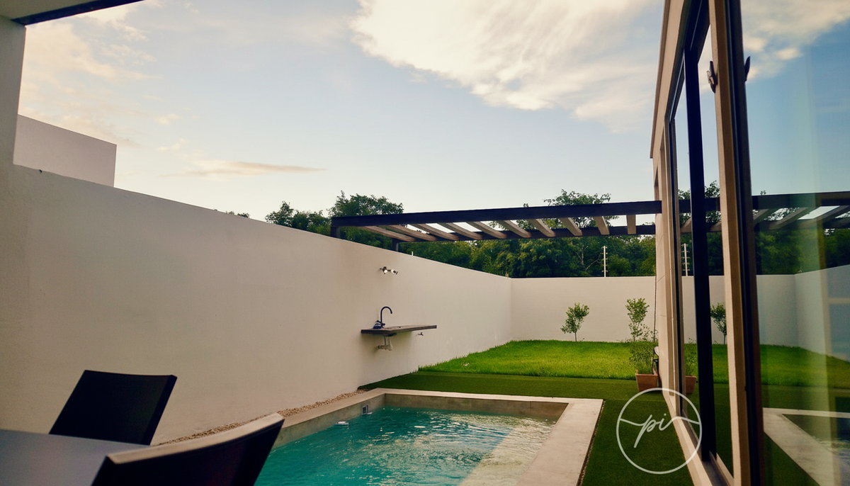 En la planta baja consta de amplia estancia, sala comedor , amplia cocina abierta, recamara con baño , 1/2 baño de visitas, terraza con vista a la alberca privada y el jardin , cuarto de juegos .