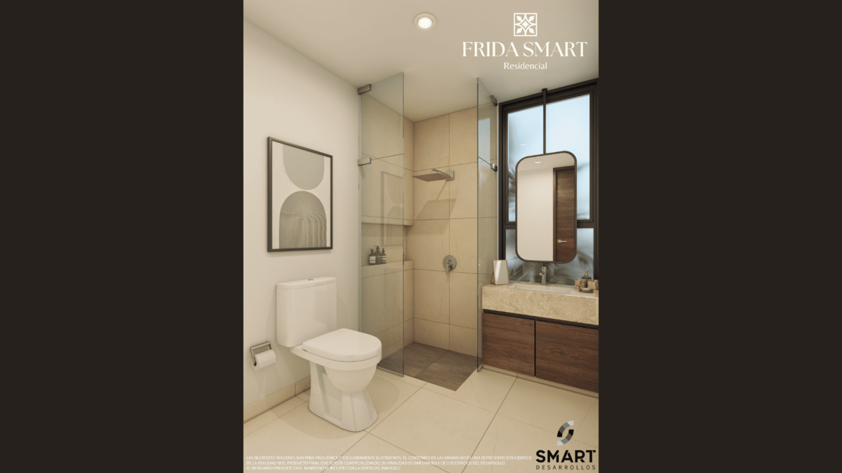 (lavabo, inodoro y regadera), 1 recámara con espacio para clóset. Cuenta con una superficie techada de 60.34 m2 y una superficie pergolada de 34.67 m2.