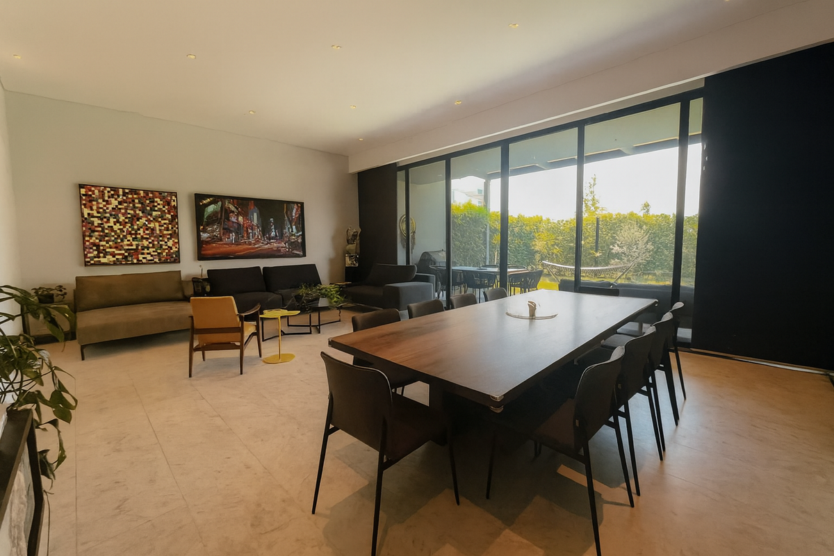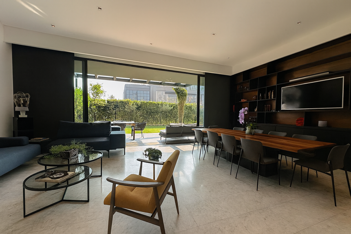 - Espacios Interiores y Exteriores: La sala y el comedor, con ventanales abatibles, se integran perfectamente con la terraza techada y el jardín privado, creando un ambiente social único. El jardín de más de 100 m² es ideal para reuniones, juegos infantiles o momentos de tranquilidad al aire libre. La terraza techada ofrece un espacio acogedor para disfrutar en cualquier temporada.
