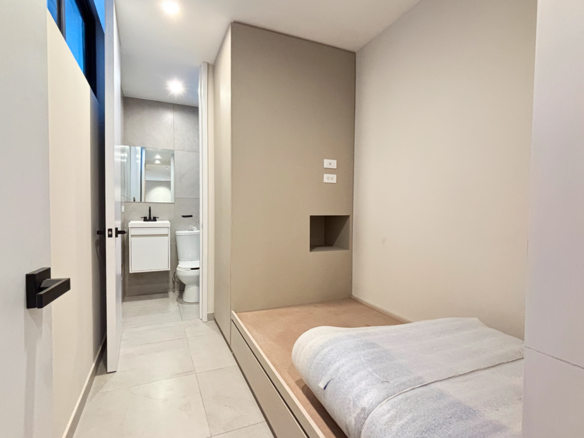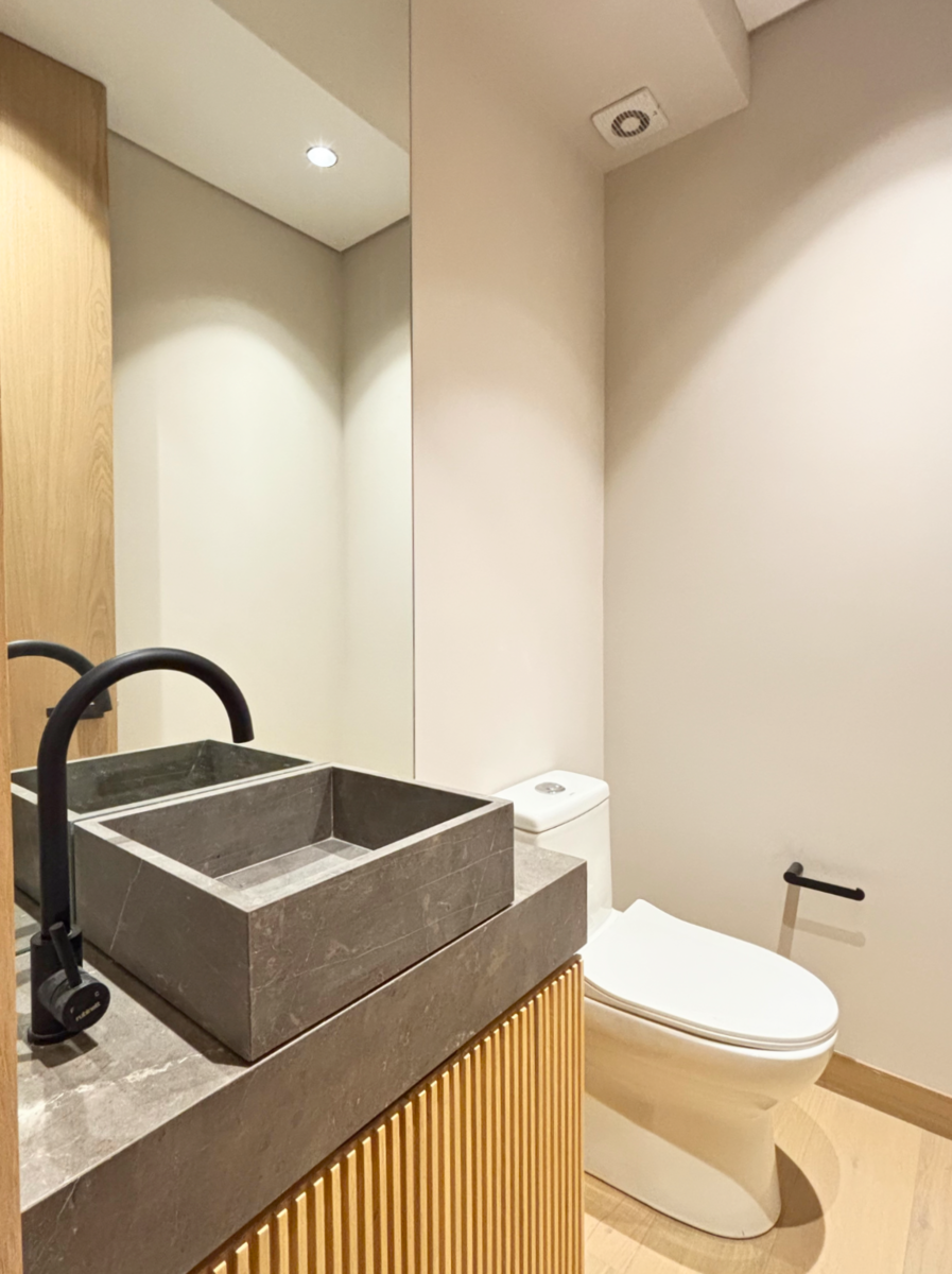 Distributed over two levels, on the ground floor it has a semi-open kitchen with access to the laundry area and a service room with a full bathroom. The living-dining room harmoniously integrates with a spacious private terrace, allowing for excellent natural light entry. On this level, there is also a bedroom with a walk-in closet and a full bathroom, with direct access to the terrace.