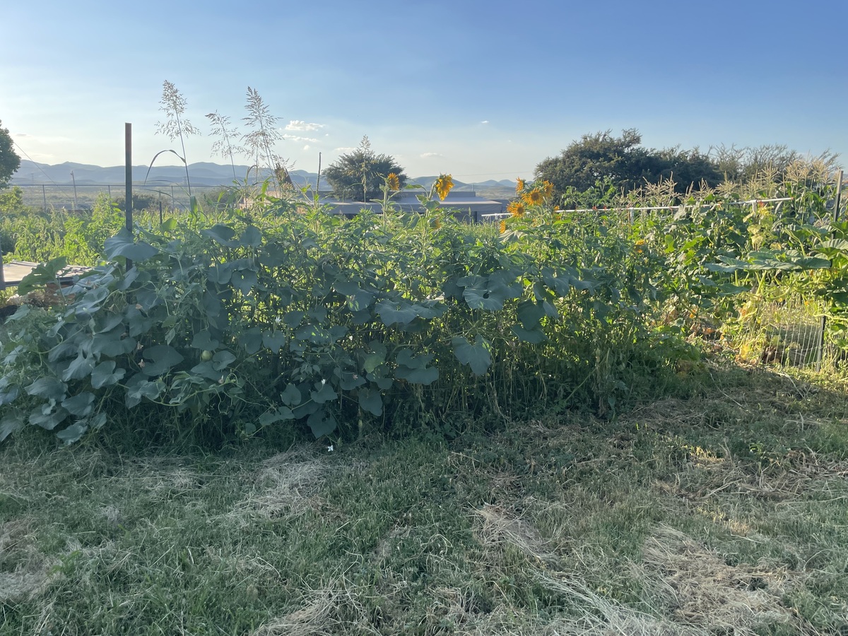 Area de árboles frutales y huerto en producción con sistema de riego, gallinero con bebederos automáticos, extensa área verde.