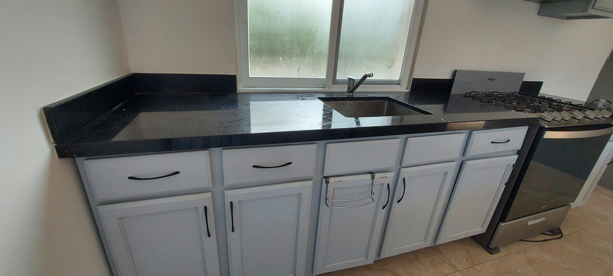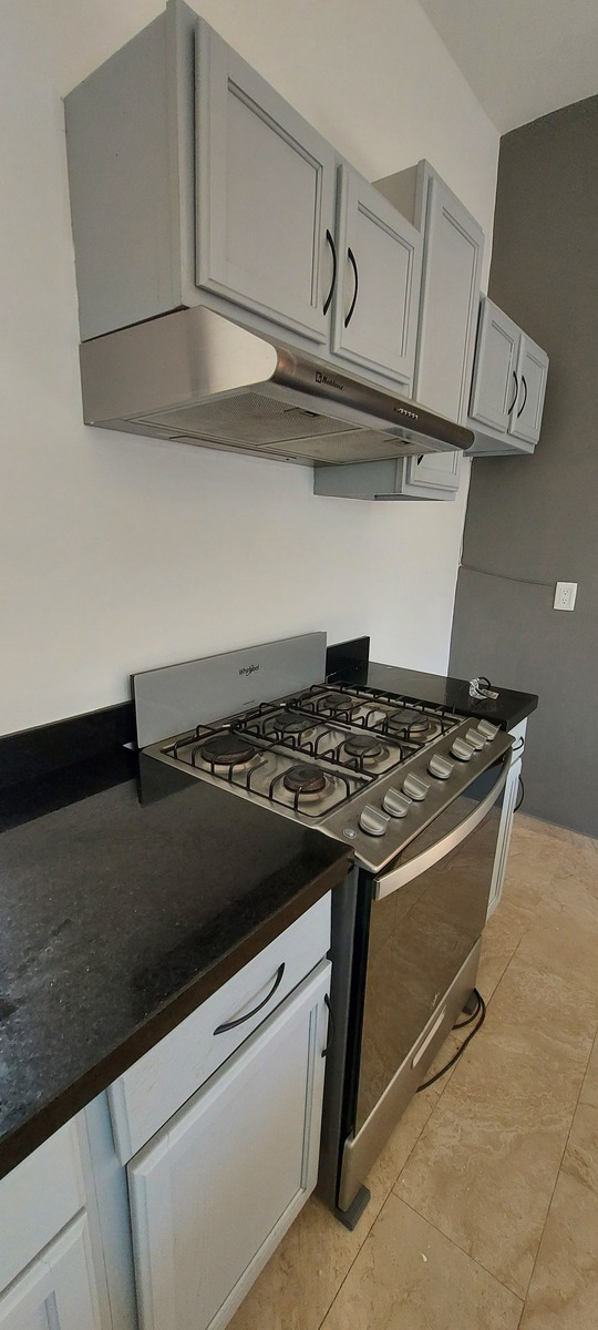 COCINA EQUIPADA CON ESTUFA DE GAS Y GABINETES .