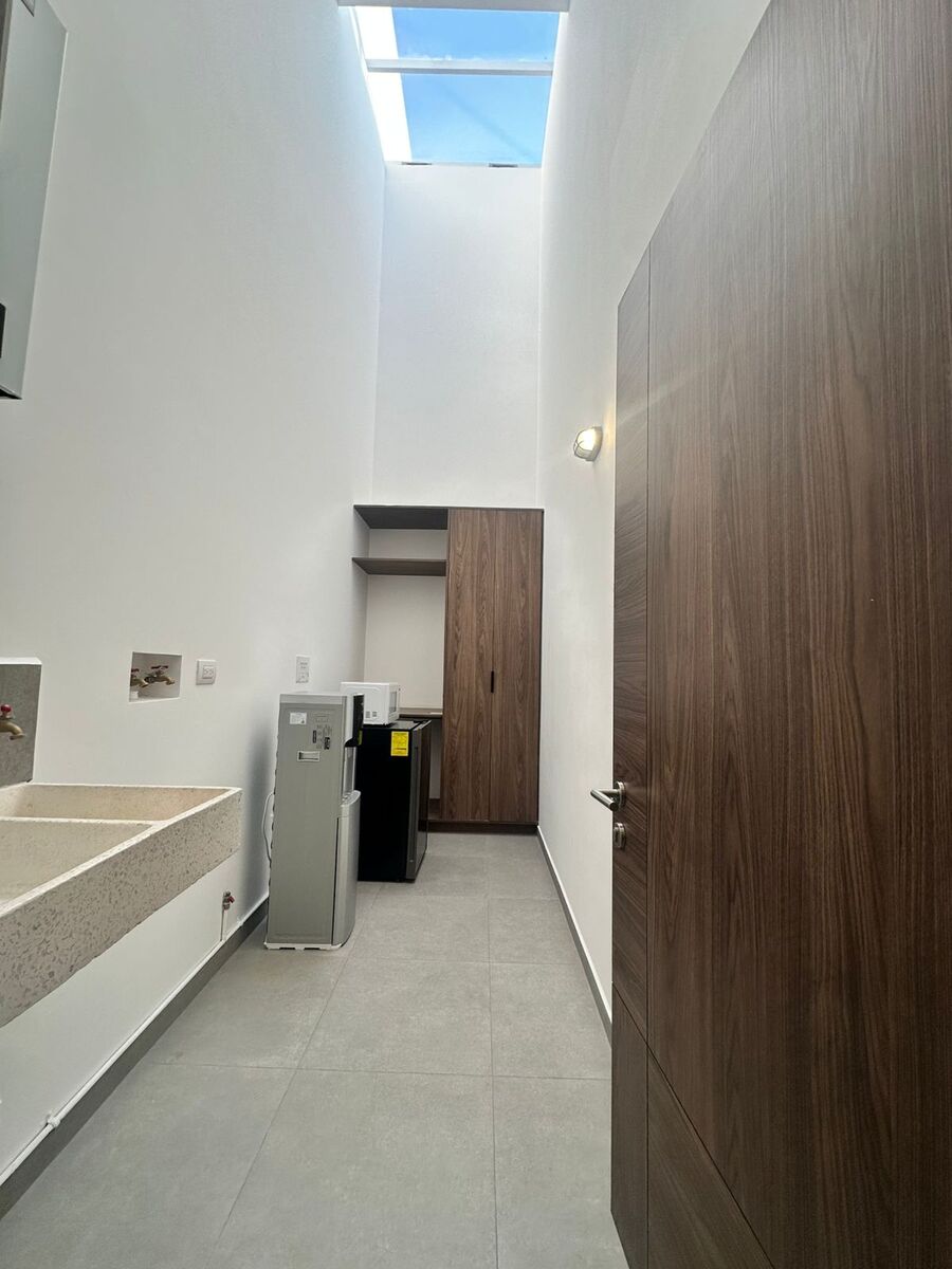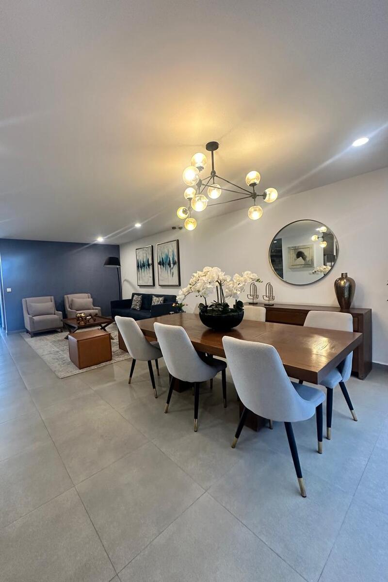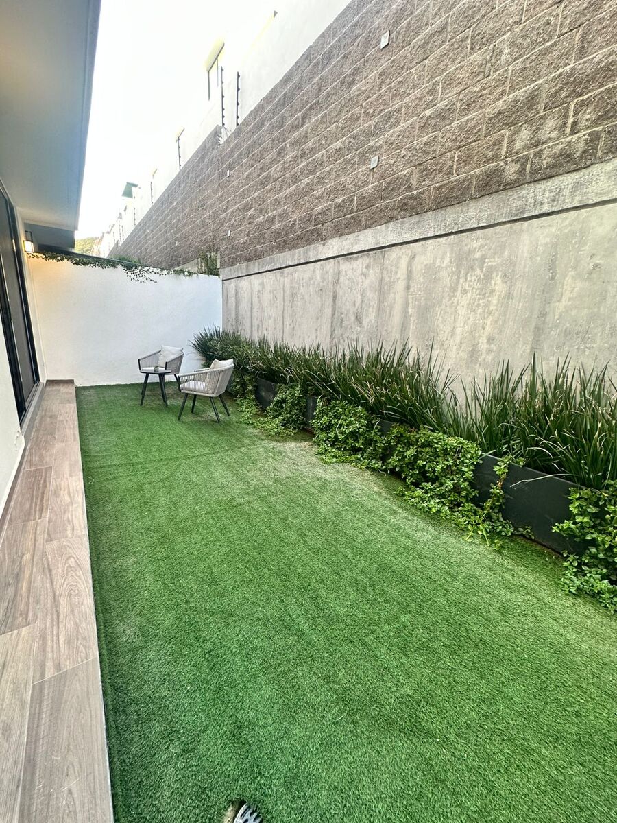 Esta elegante casa de dos niveles te recibe con cochera techada para dos autos, un estudio ideal para oficina o cuarto de lectura en planta baja, medio baño para visitas, y una luminosa área social con sala y comedor que se integra armoniosamente al jardín trasero. La cocina es amplia equipada con torre de hornos y carpintería de primera, con barra desayunadora, alacenas generosas y área de lavado discreta y funcional con doble altura