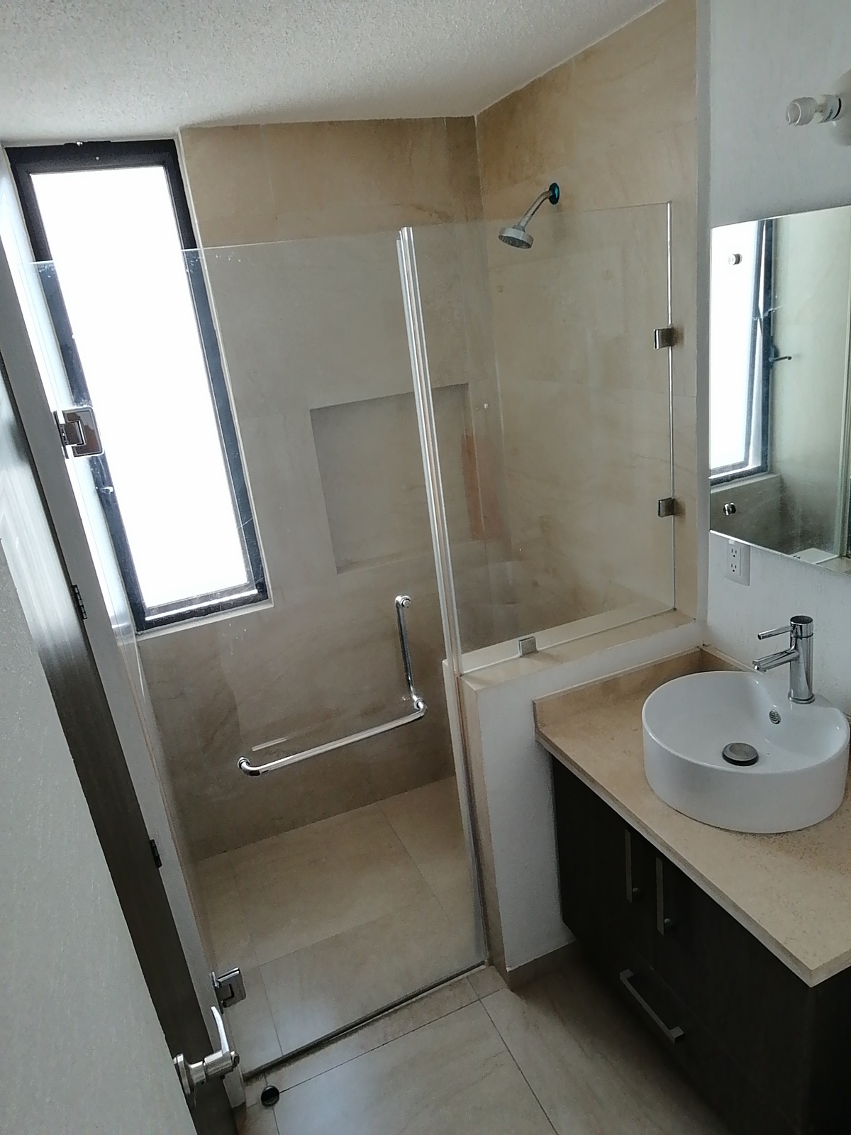 2 BAÑOS COMPLETOS CON CANCEL DE VIDRIO Y ESPEJOS.
