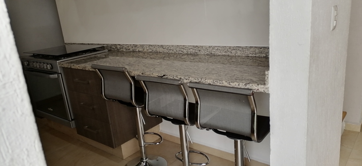 KITCHEN WITH COUNTER AND 3 STOOLS.