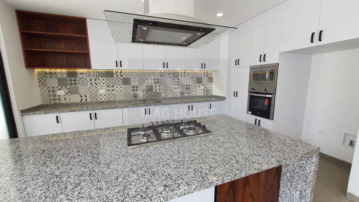 • COCINA CON CUBIERTA DE GRANITO (PARRILLA EN ISLA Y HORNO DE GAS POR