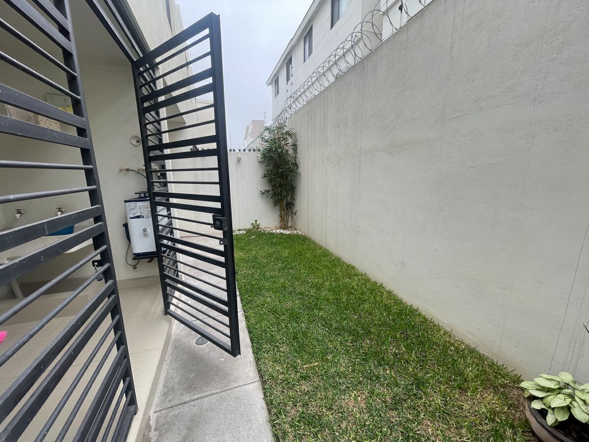 ✨ Planta baja: sala, comedor, cocina equipada con estufa y campana, medio baño, patio con césped y pasillo lateral.