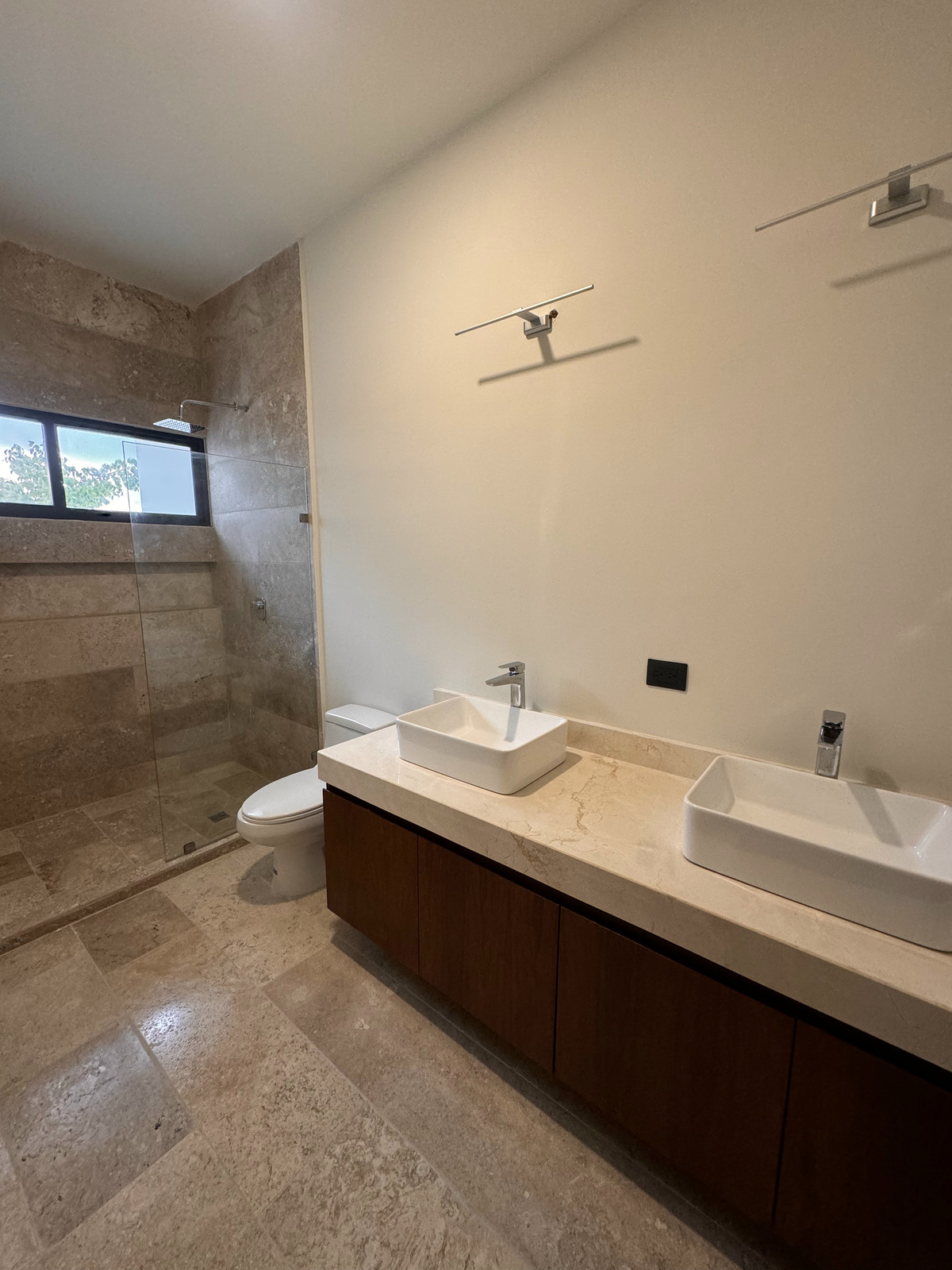 • Bathrooms with "crema marfil" marble countertops
