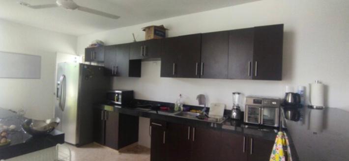 2 niveles, totalmente amueblada y con amplios espacios, cocina integral totalmente equipada, cuenta con gabinetes, electrodomésticos, estufa y refrigerador, cuenta con una isla desayunador con bancos, baño de visitas con tina, cuarto de servicio con área de lavado con lavadora y secadora, closet de blancos en el pasillo, balcón con vista al jardín trasero, jardín con pasto, plantas y árboles frutales, además con paneles solares, 4 aires acondicionados, 6 ventiladores de techo, estacionamiento para 2 autos con varias plantas que le dan sombra a los autos. Con amenidades, salón de usos múltiples, gym, piscina, canal de nado, terraza de BBQ, juegos y chapoteadero para niños, canchas multiples.