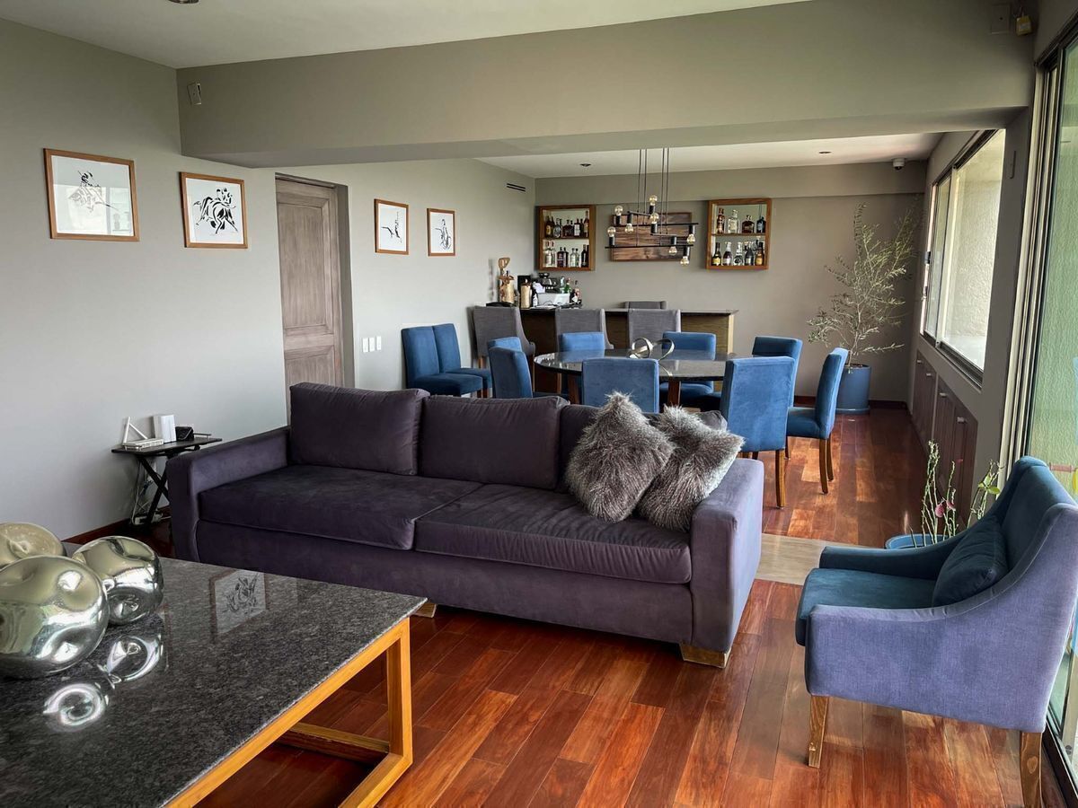 La sala de estar y el comedor son espaciosos y luminosos, con acceso a una terraza que ofrece impresionantes vistas panorámicas del bosque y del parque de La Mexicana, brindando un ambiente tranquilo y relajante. También hay una sala de televisión separada, ideal para momentos de entretenimiento y relajación.