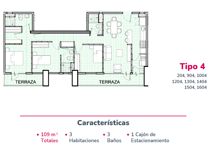 El Departamento 1004 de Tipologia exterior, tiene un Área Habitable de 91.63M2 + Área de Balcón/Terraza 17.14M2 = Área Total 108.77M2