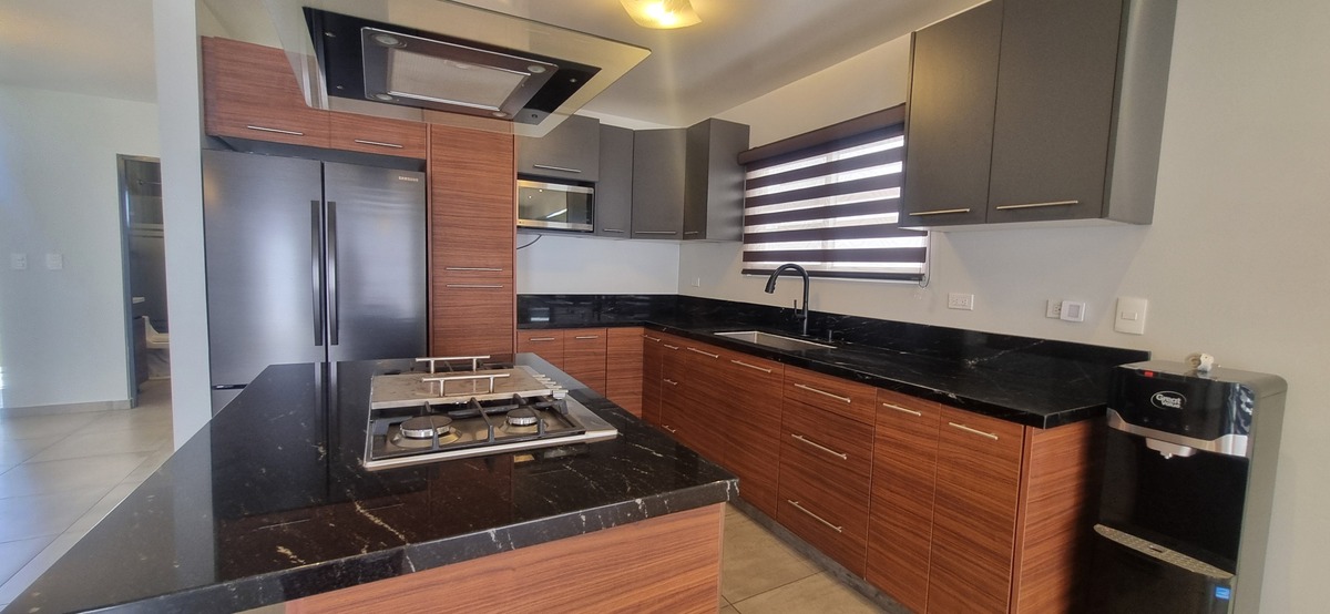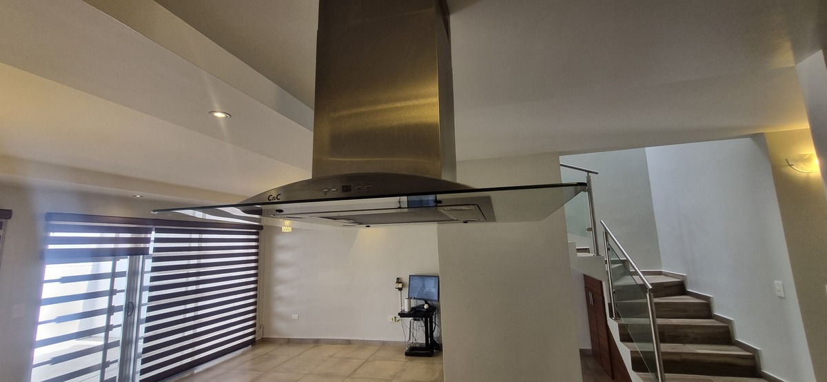 Isla central con campana, refrigeradorl, estufa, microhondas y porta garrafon.