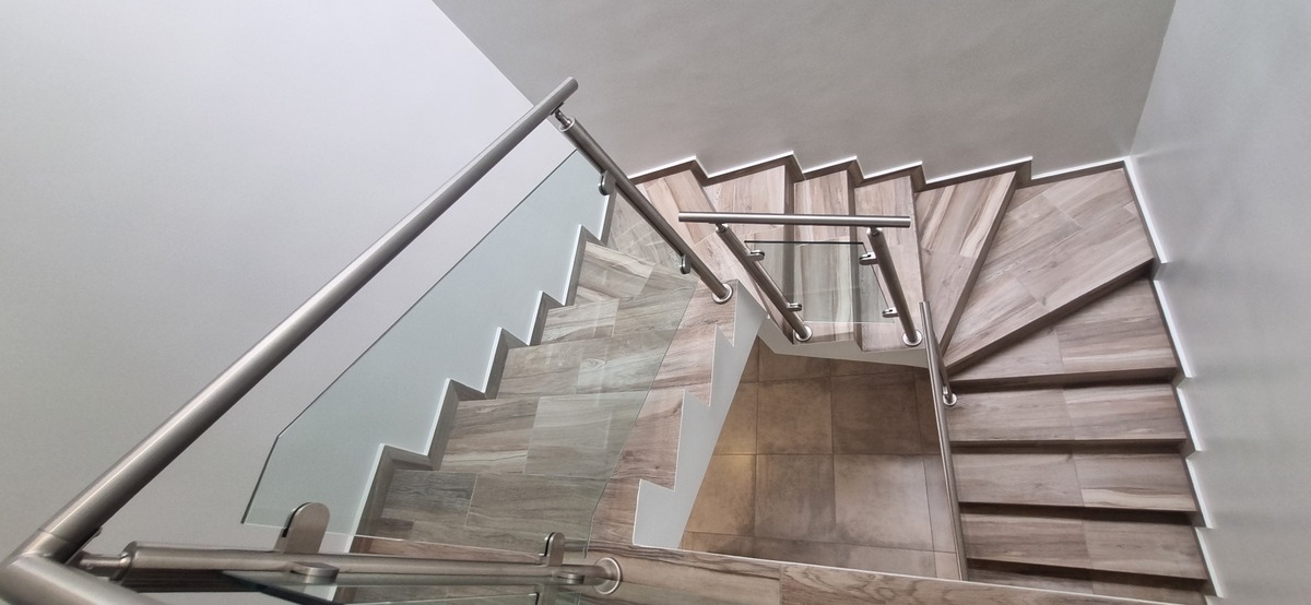 Modern railing on the stairs.