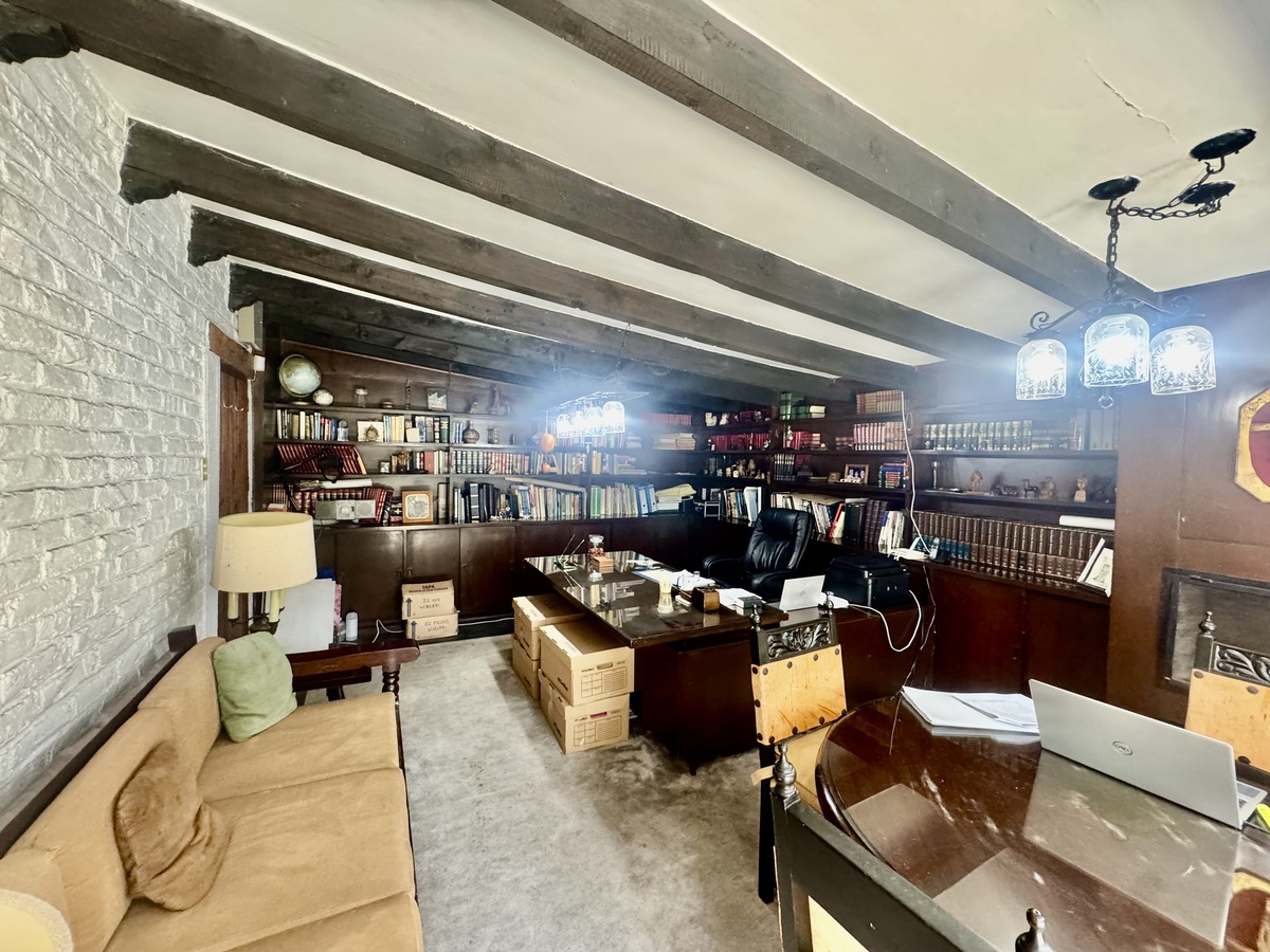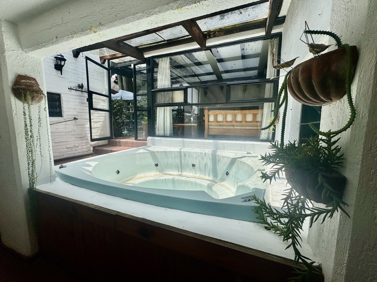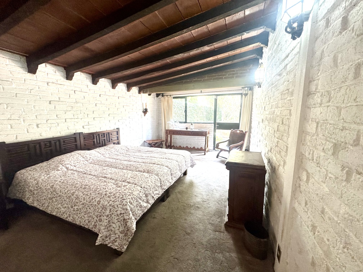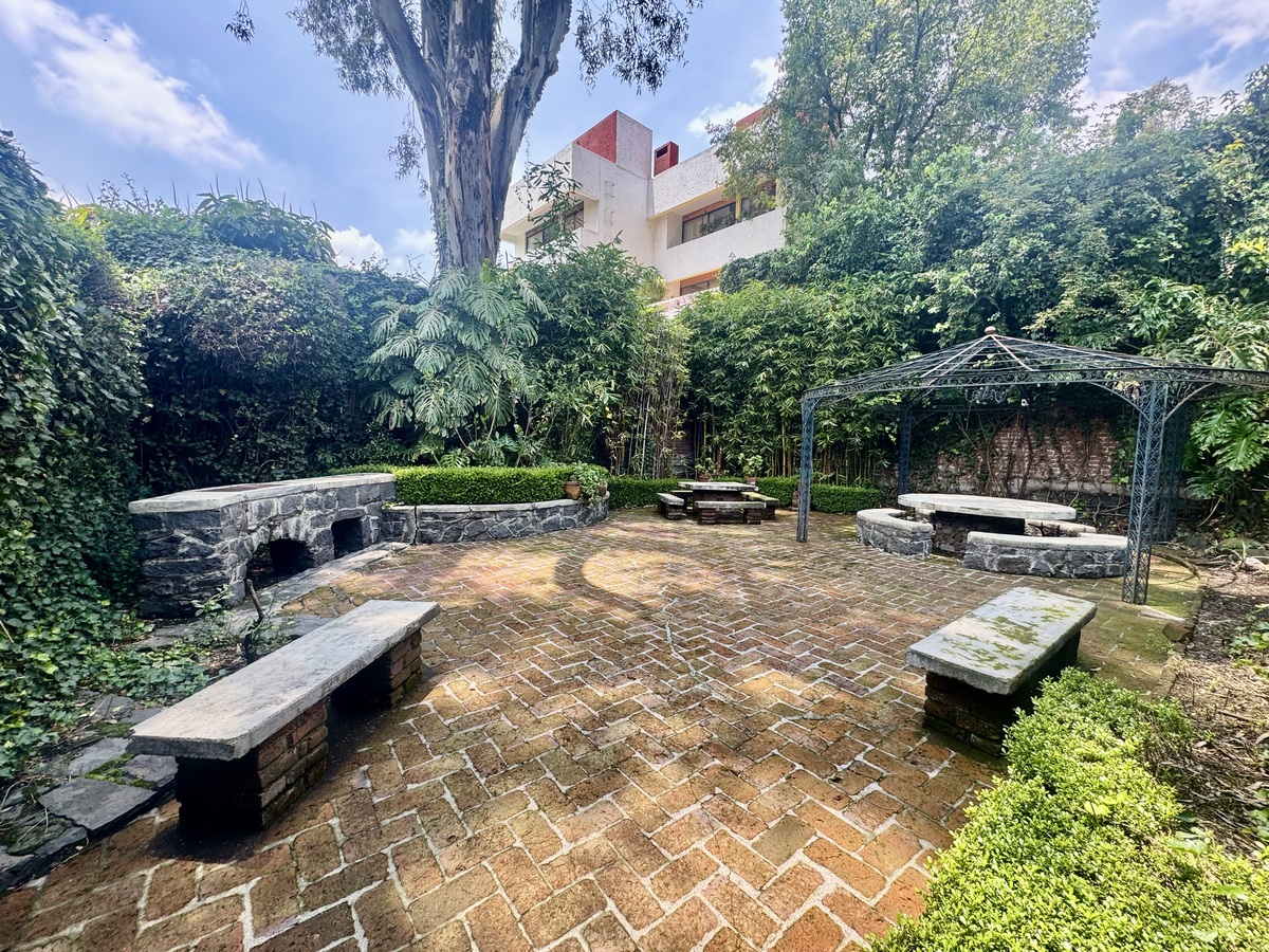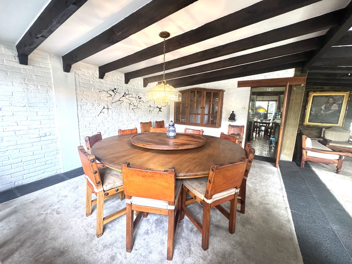 Tiene una amplia e iluminada sala comedor con salida al espectacular jardín que tiene plantas y palmeras, terraza con asador y una linda fuente. Cocina cerrada y ante comedor. Cuenta con cuarto de servicio y baño de servicio y medio baño de chóferes con Caseta de Vigilancia. Ideal para actualizar y dejarla a tu gusto. Uso de suelo habitacional para 2 casas.