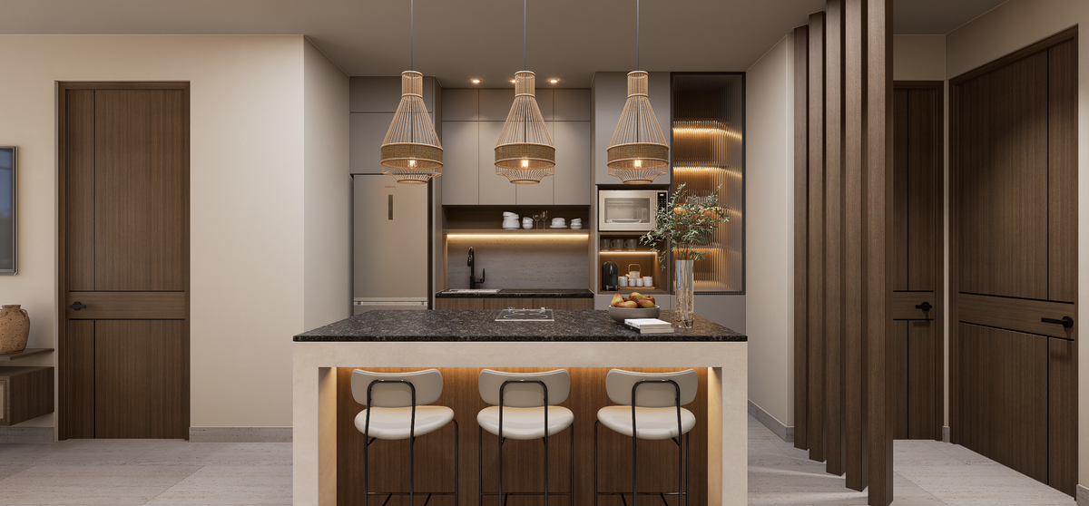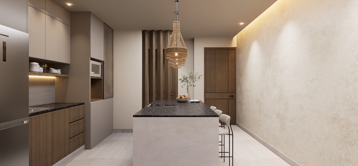 Todos los departamentos están equipados con cocinas modernas con barra de granito y parrilla eléctrica, además de un espacio para lavasecadora.
