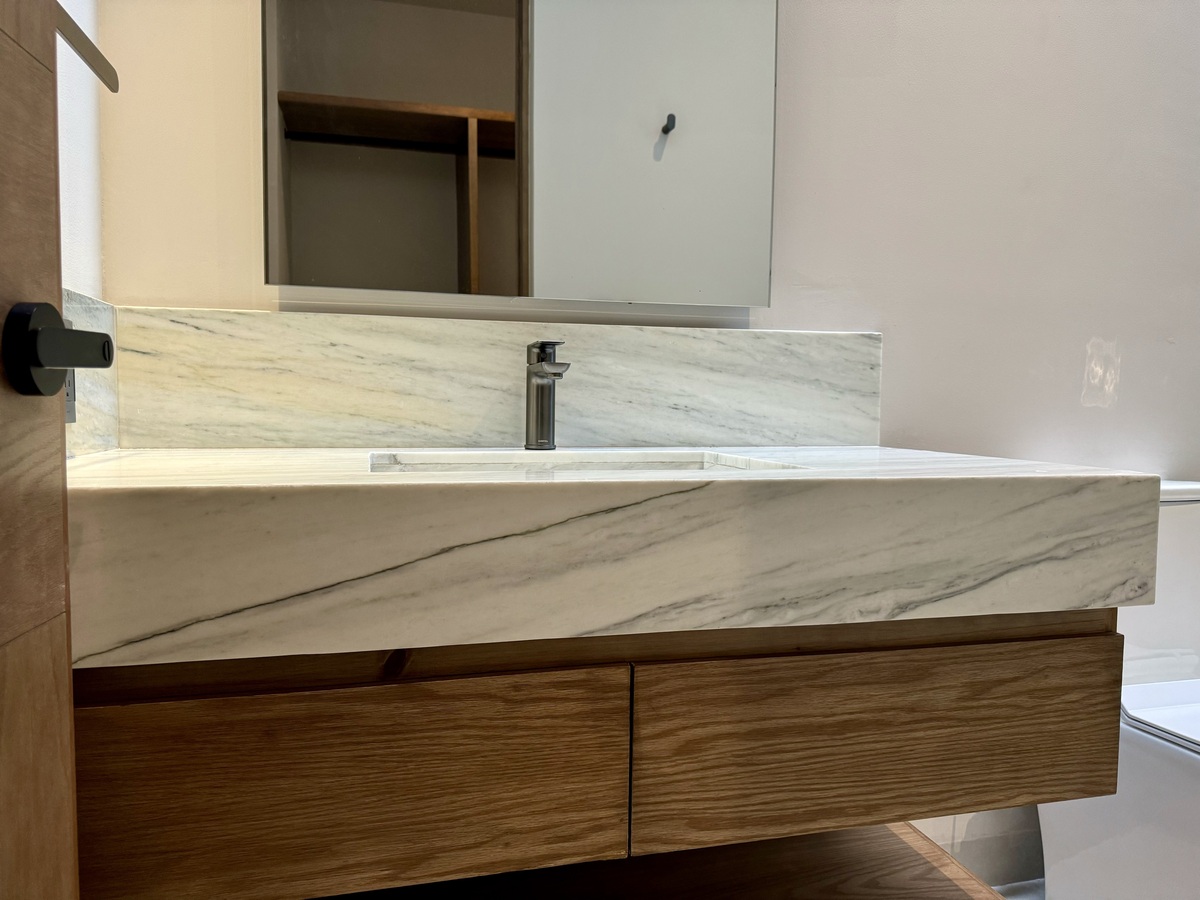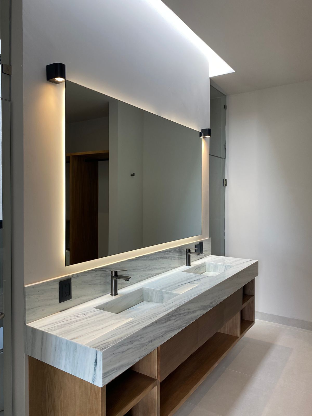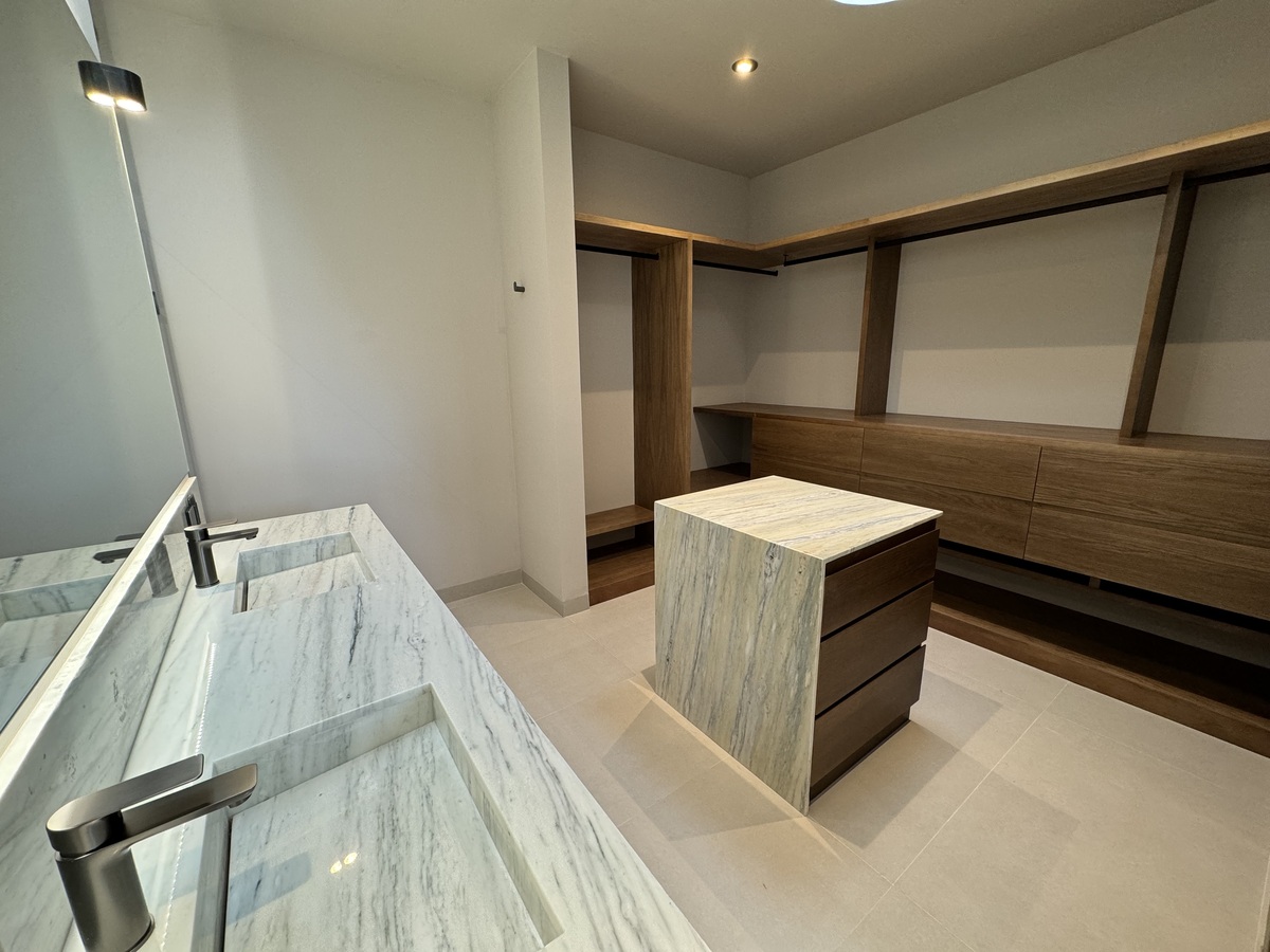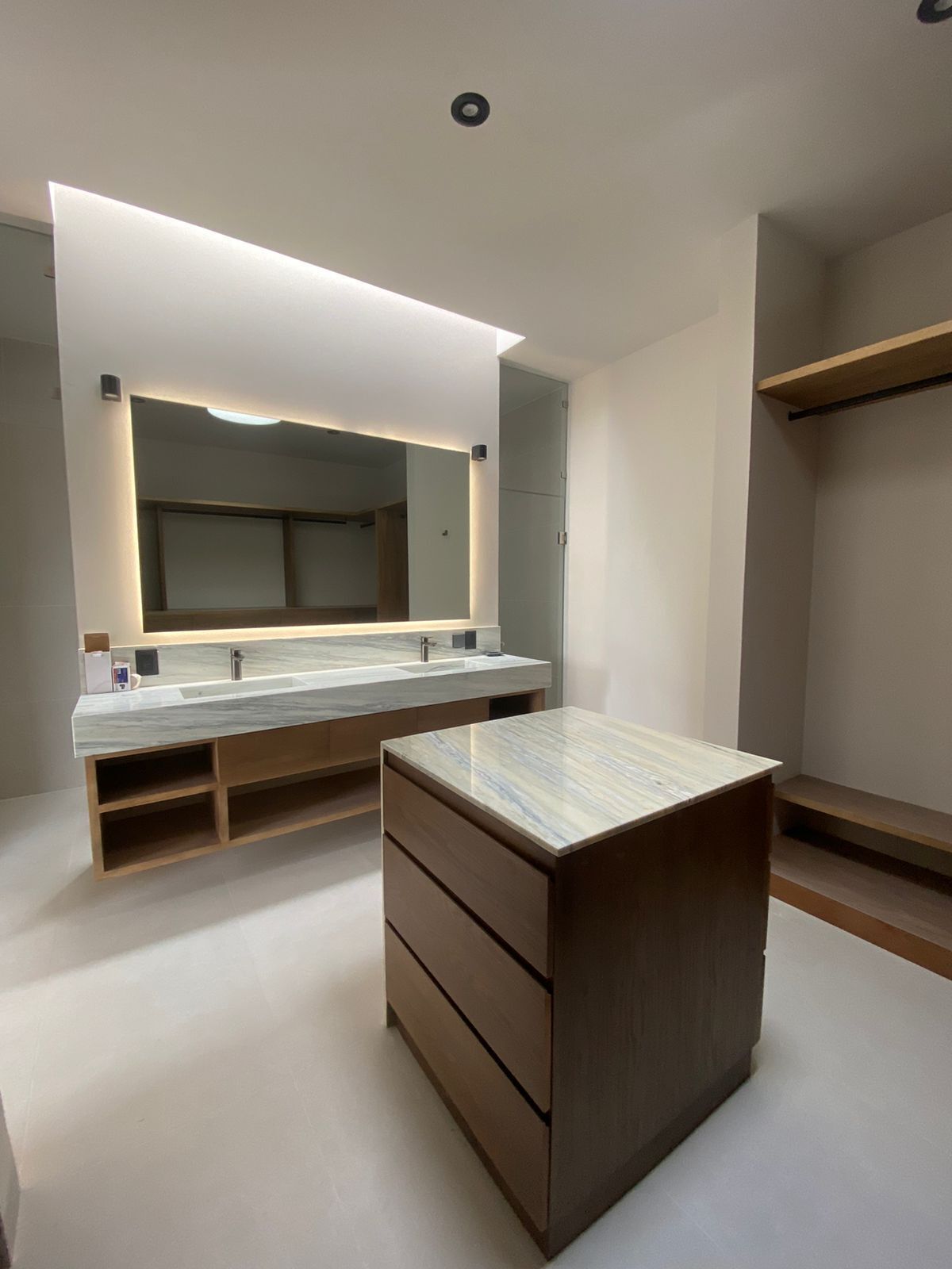 - Puertas de piso a techo, muebles de baño, vestidores: Madera de encino