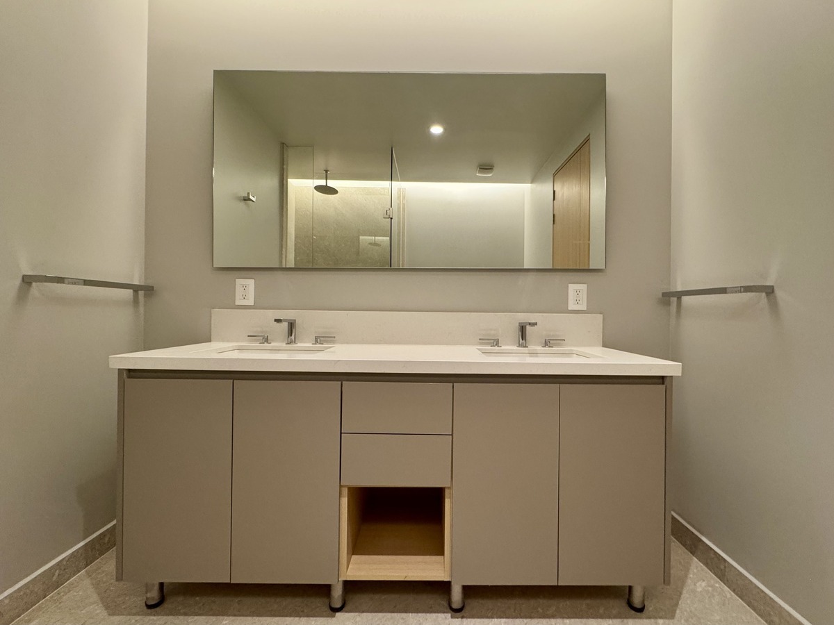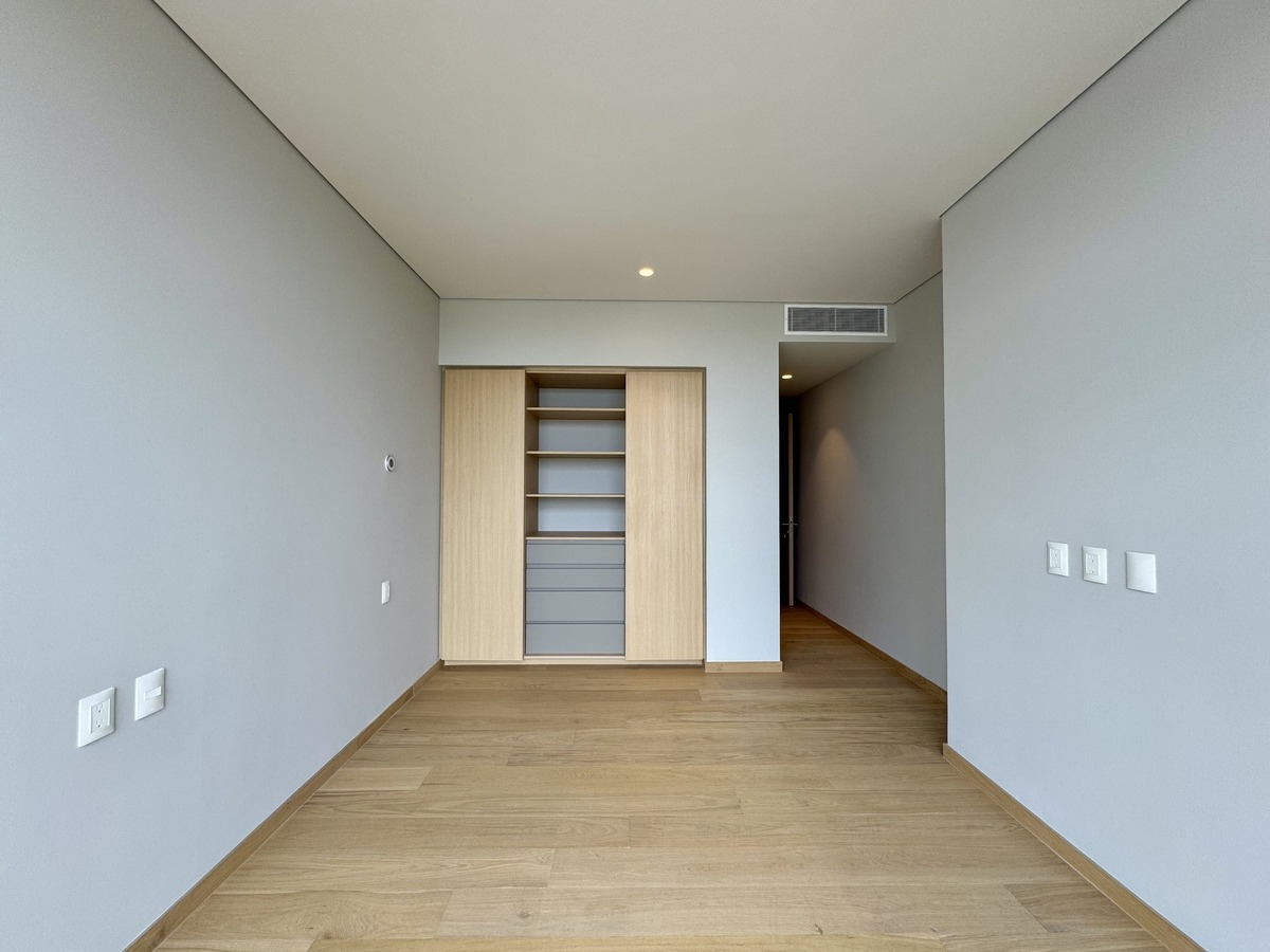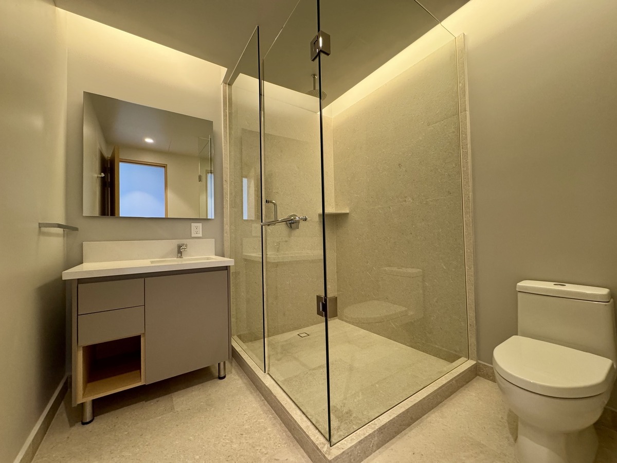 2 recámaras, ambas con baño privado; la principal incluye vestidor. Medio baño de visitas. Sala y comedor con ventanales de piso a techo y acceso al balcón. Espacio ideal para TV o home office. Cocina equipada con electrodomésticos de alta gama. Cuarto de lavado con baño de servicio. Aire acondicionado central y persianas tipo blackout ya instaladas. 2 estacionamientos techados + bodega privada.